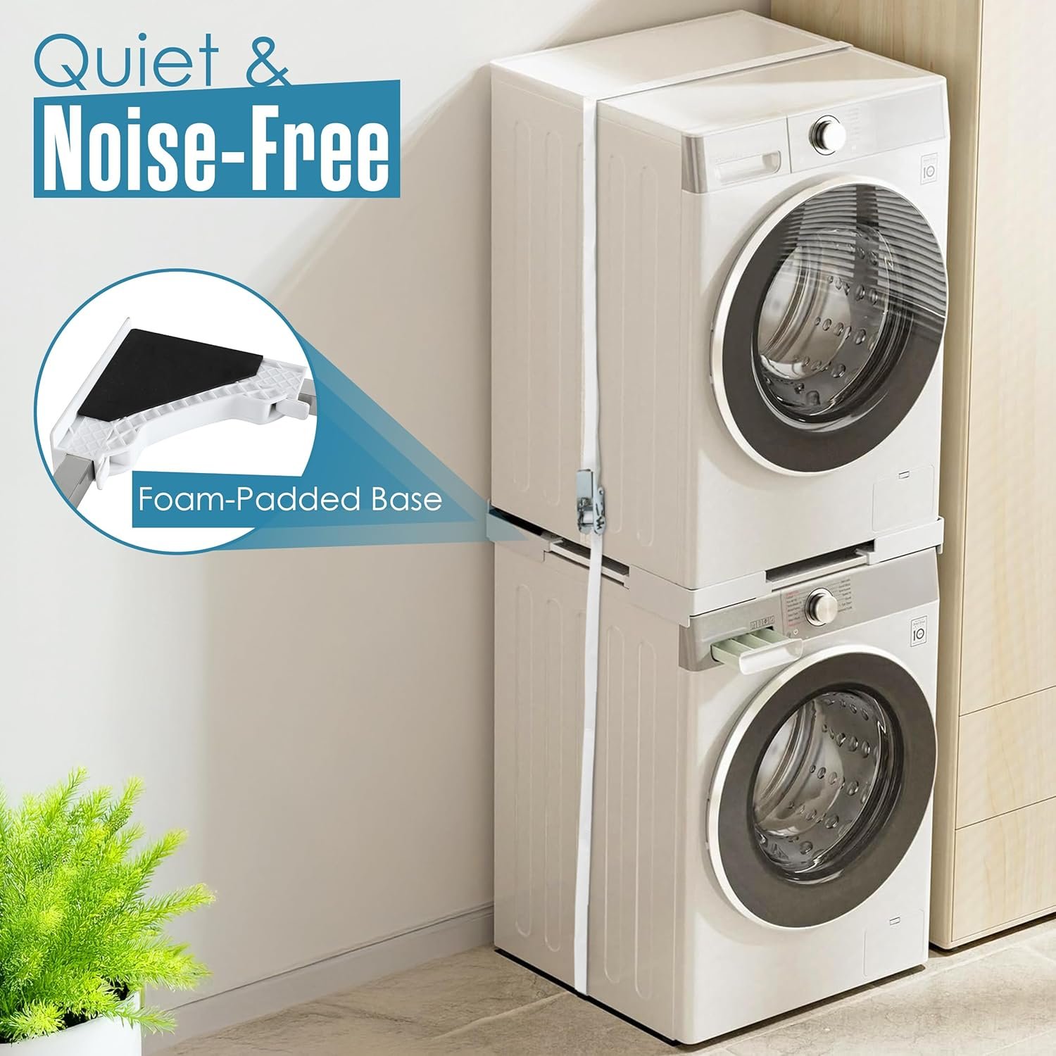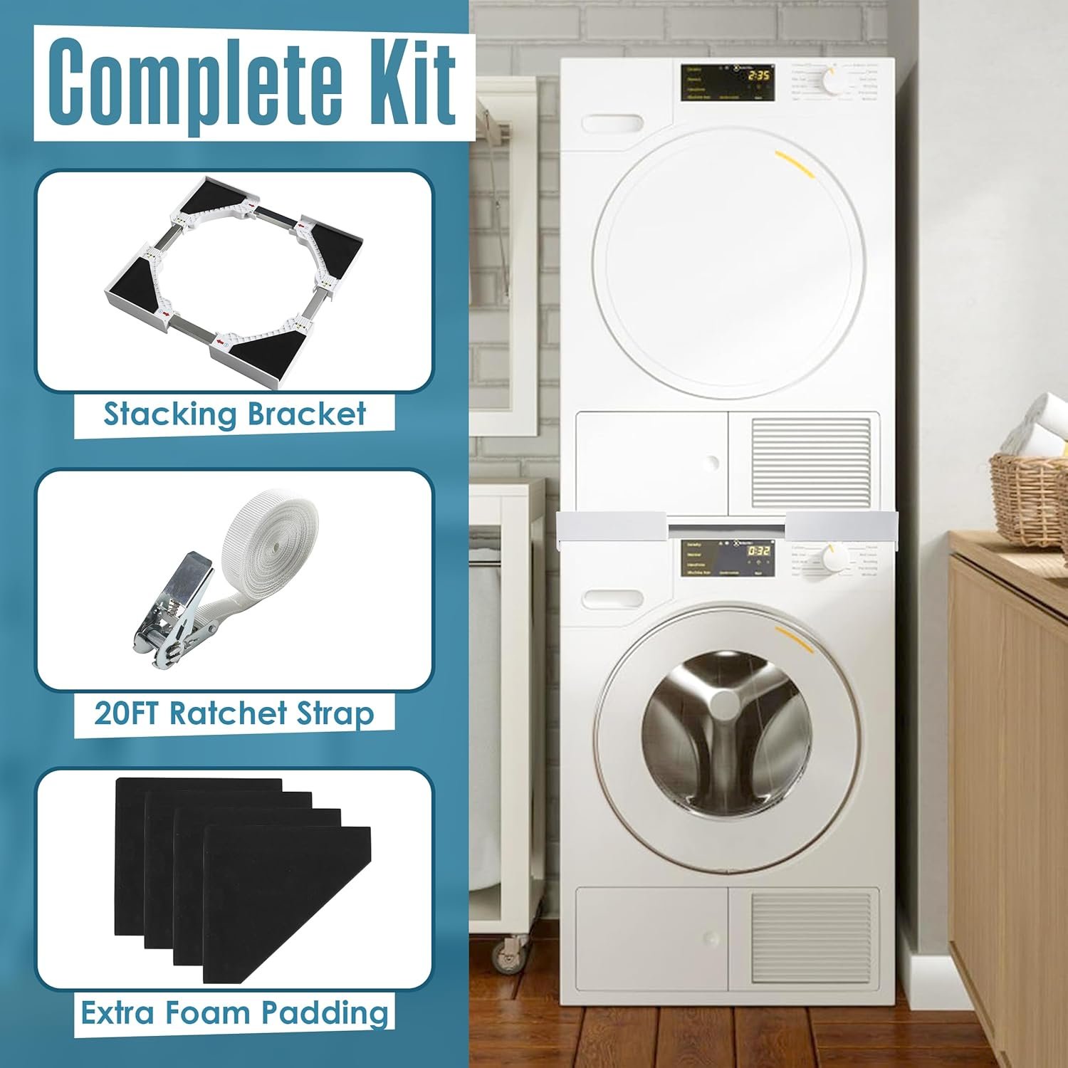 COMPLETE KIT – This laundry stacking kit includes everything you need for a secure installation: an adjustable bracket, a heavy duty ratchet strap, and extra foam pads. No additional tools or parts are required, making setup straightforward and hassle-free.