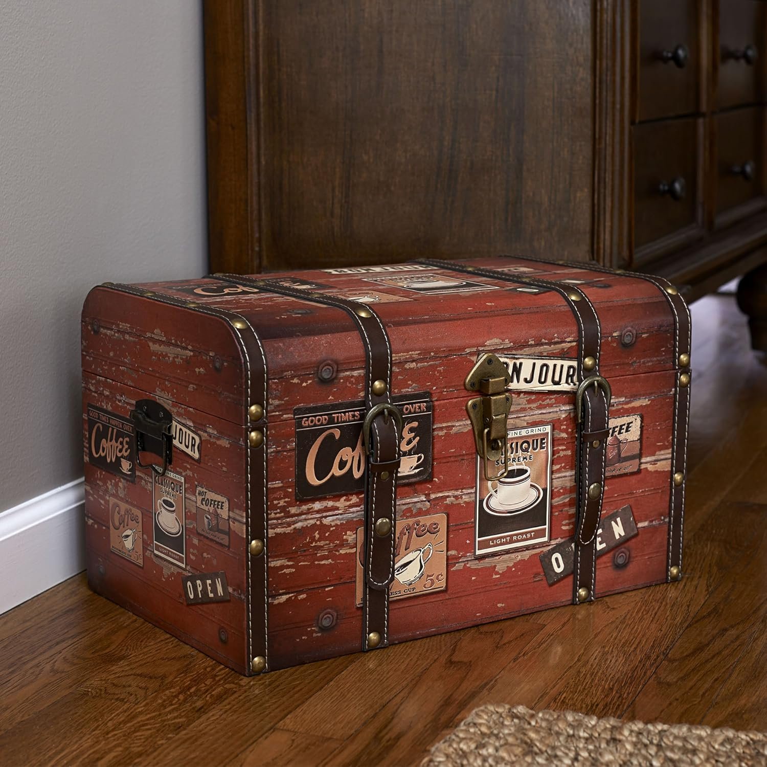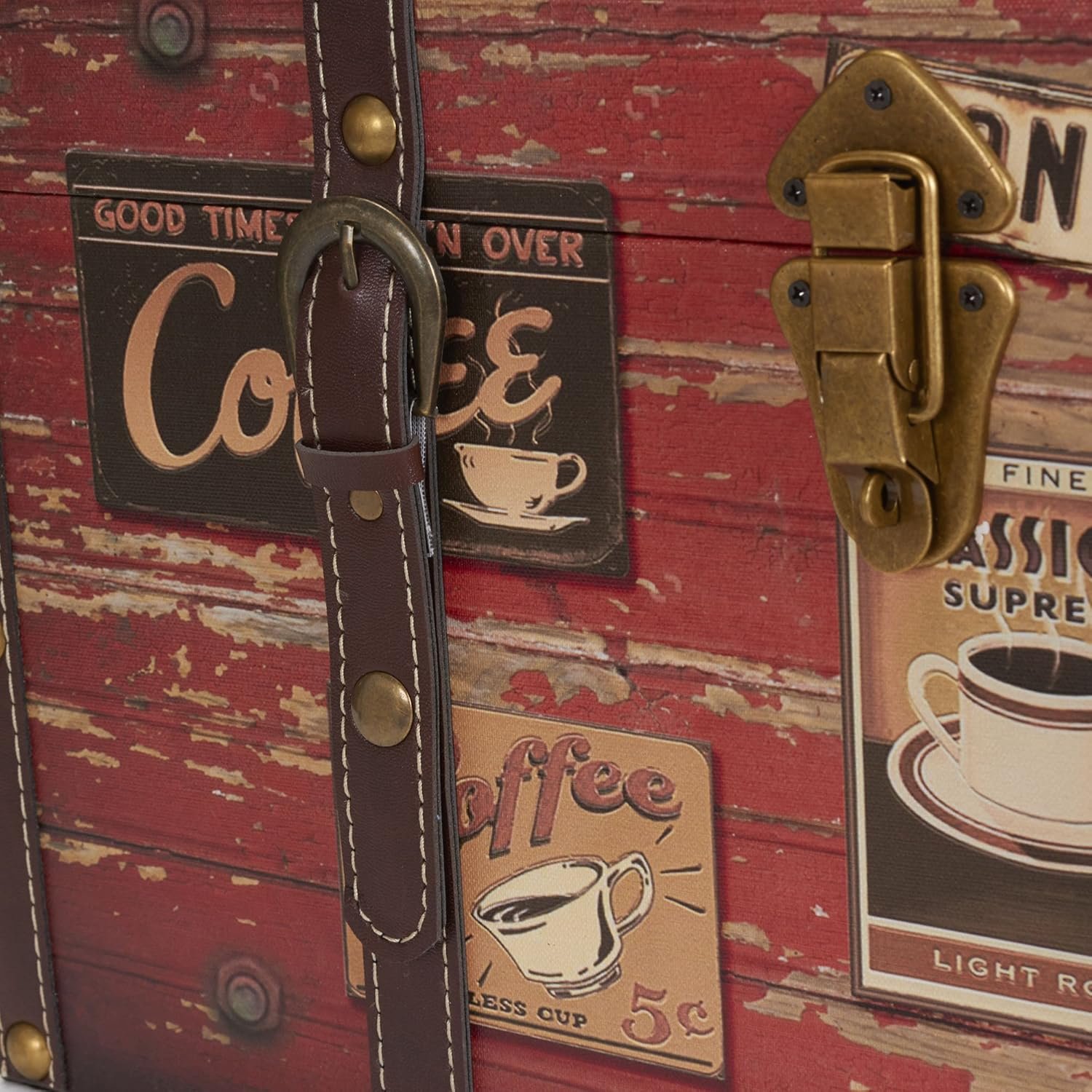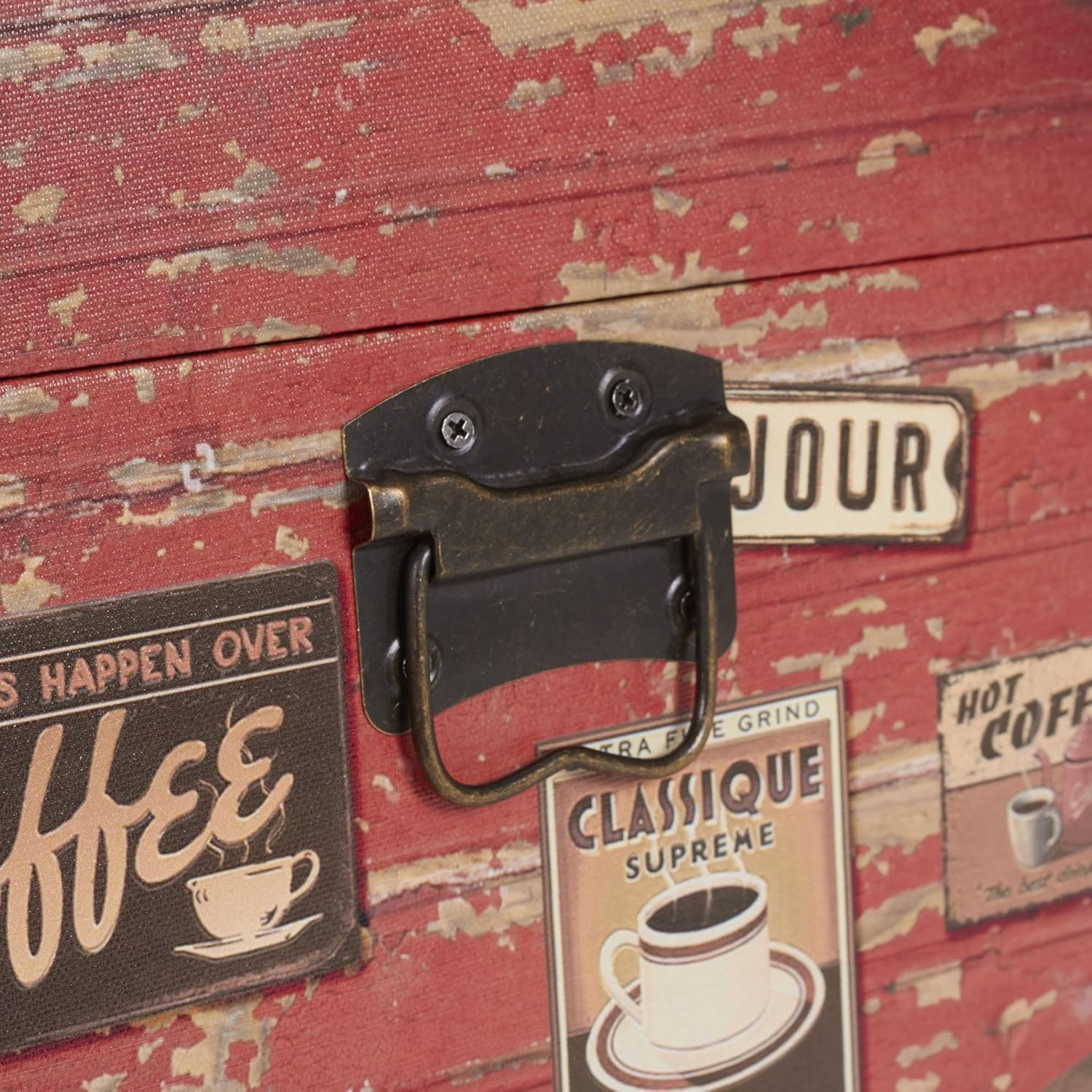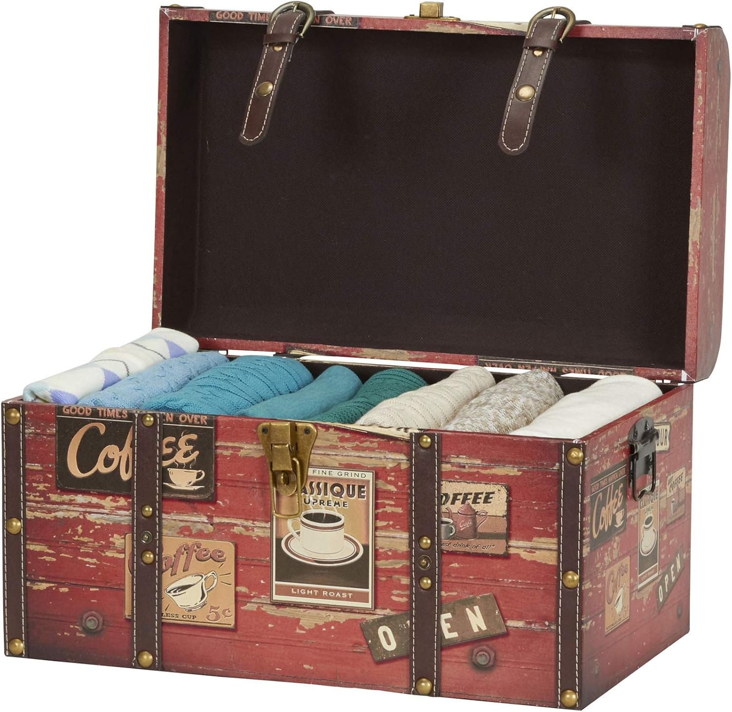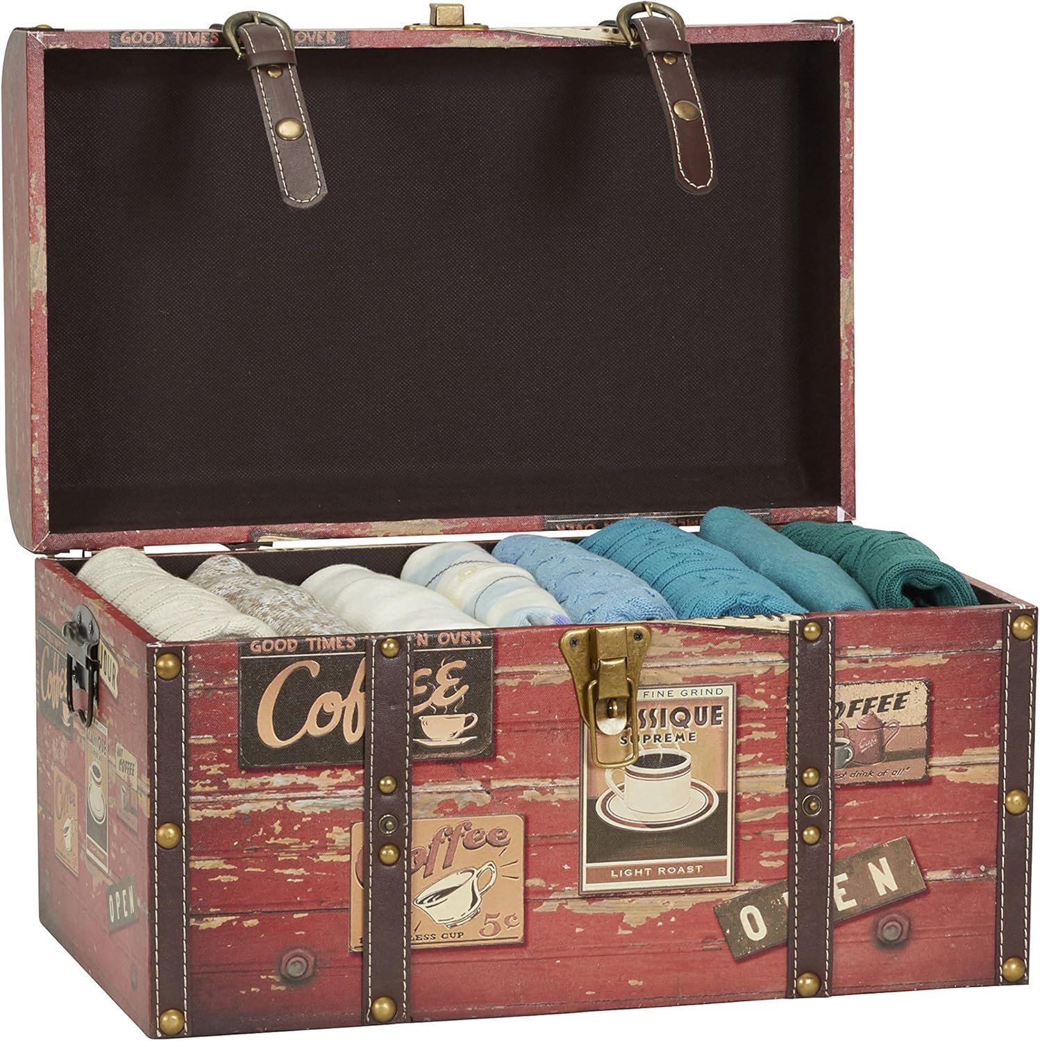 This medium decorative trunk is every coffee lover’s dream with its distressed style and coffee shop faux decoupage