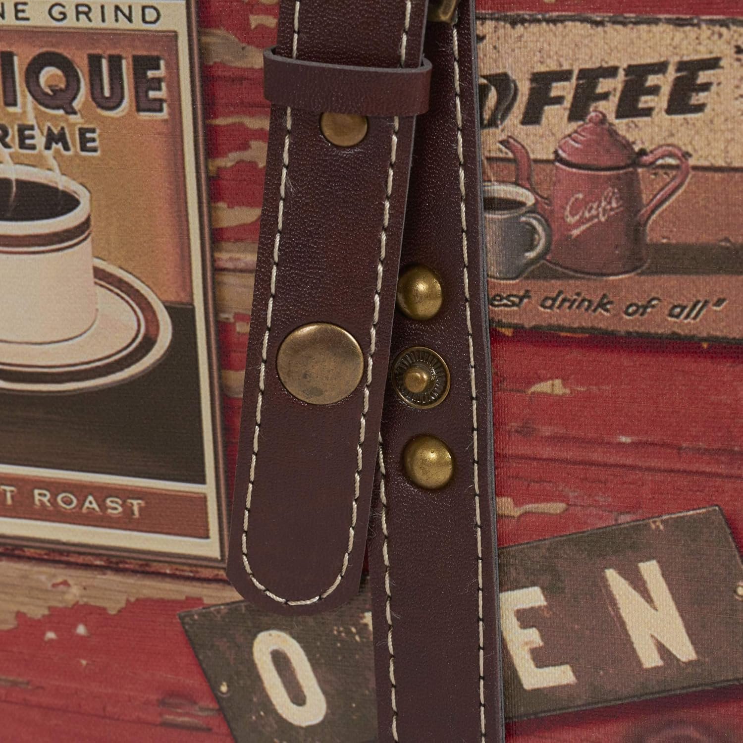 A wonderful piece to create the perfect cafe-inspired home, this decorative trunk is not only a great accent piece but also a versatile storage option. Show a bit of your taste in your home with the inclusion of this charming storage trunk. This medium storage trunk offers an ample amount of space to store all types of items such as books, throw blankets, a stash of coffee and tea or even board games. The versatile but stylish design makes this trunk perfect for any room of the home, including the living room, bedroom, closet, personal library and entryway. The trunk is made of a durable MDF. The exterior is lined with a durable, printed canvas, while the interior is lined with fabric. The lid is attached with reliable hinges that also have extra supports. Instead of plain wood, the interior is lined with a gentle fabric. With its coffee-inspired faux decoupage, this trunk is just as good for decor as it is for functional storage. After a coffee-lover’s heart, the coffee images and distressed look give the impression of a seasoned traveler with a knack for the finer drinks in life. The leather straps easily snap and unsnap from the front of the trunk, and the metal accents add to the antique aesthetic.