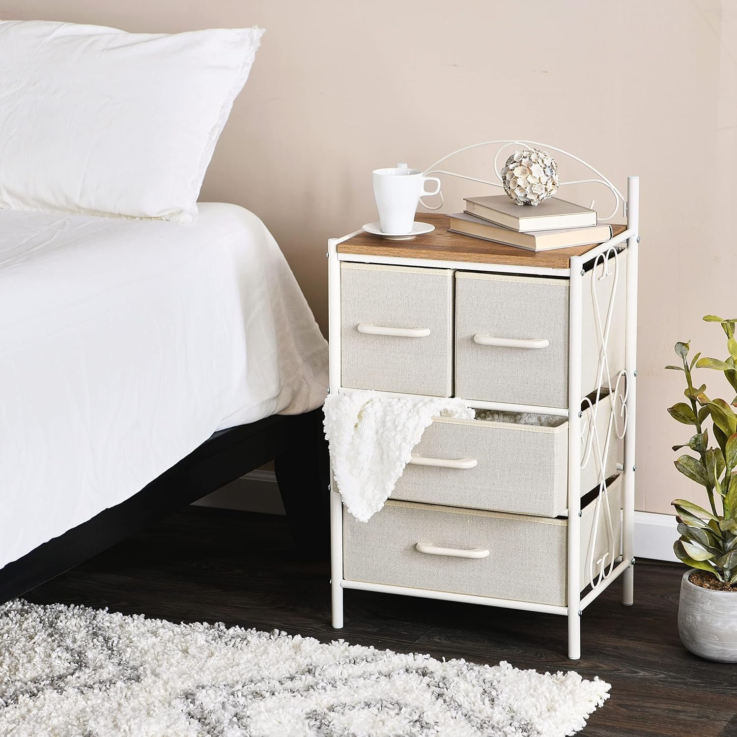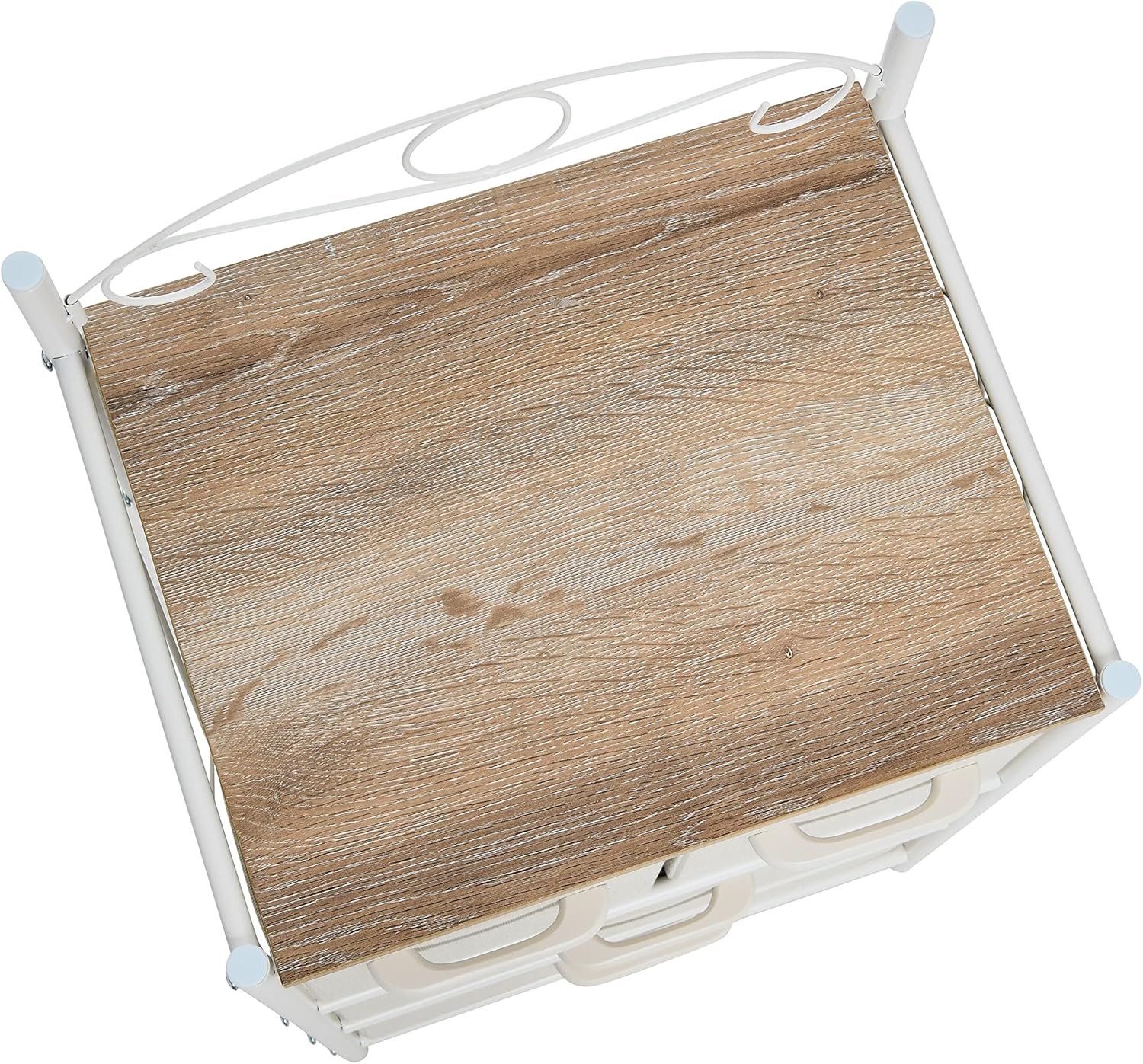 A stylish storage solution featuring a white metal frame with a coastal oak rustic wood grain top and 4 drawers in beige to provide ample storage for personal items
