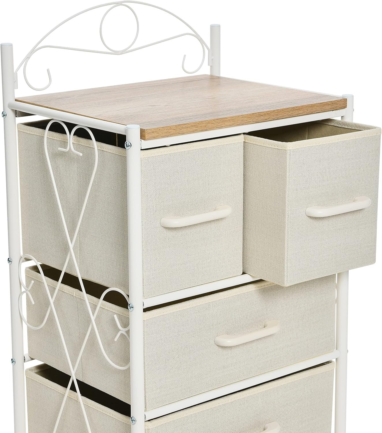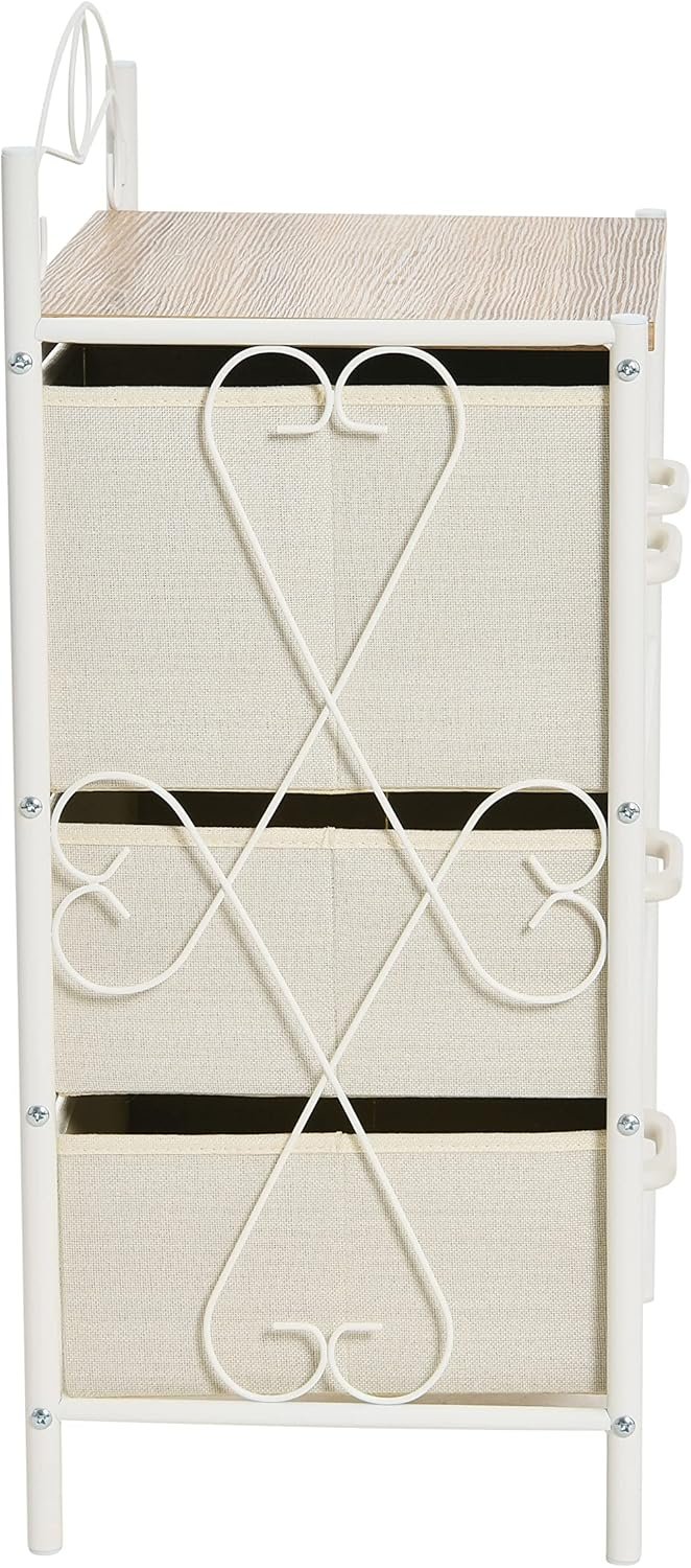 This Victorian Style 4-Drawer Storage Organizer Unit in White and Beige features a white metal frame with a coastal oak rustic wood grain top. The organizer includes two medium drawers at the top and two large drawers in beige that can be rearranged in the tower to create a variety of looks. Aside from the top two drawers, the lower drawers can be placed in any order. The decorative wire arch on the top design has Victorian influences but also fits well into Coastal, Beach, Rustic, or even Contemporary styles. Made of durable metal legs and frame paired with durable wood finished in scratch-resistant wood grain laminate, cloth drawers, and plastic handles. The decorative wire arch on the top design is removable. Measures 17.25 inches in length, 13.0 inches in width, and 31.75 inches in height.