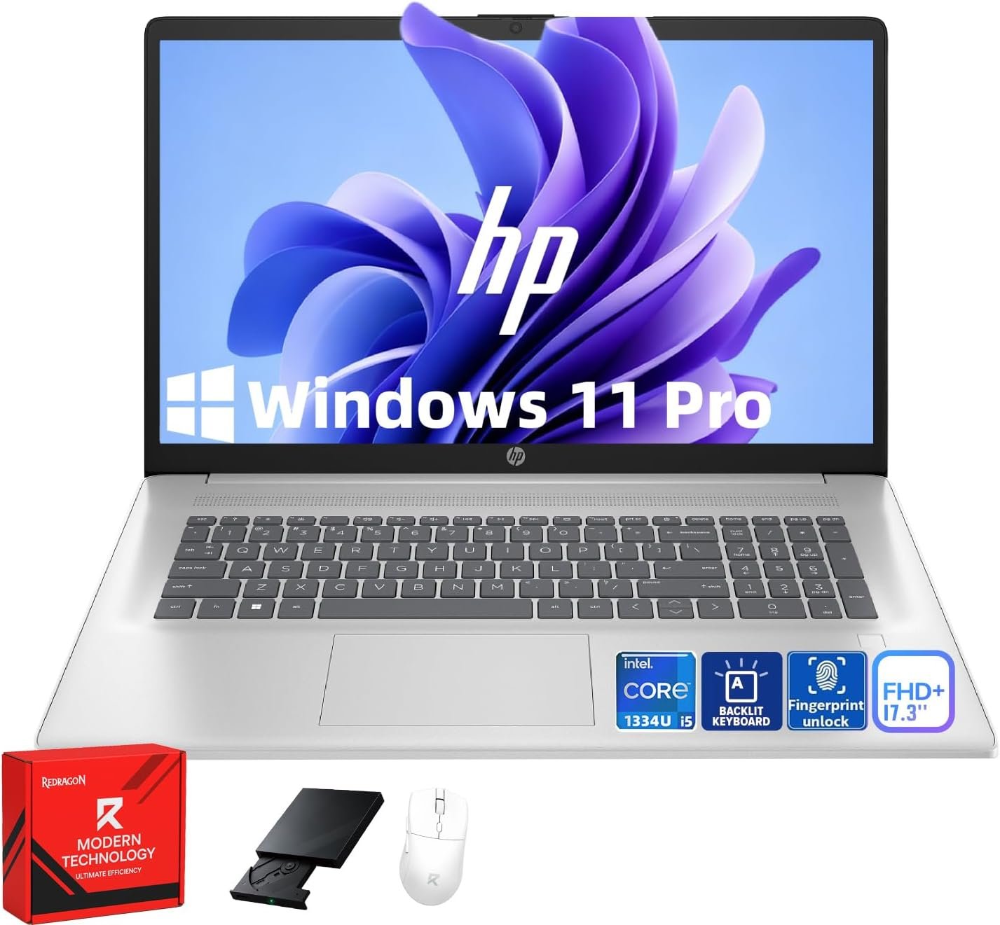 HP 17t Laptop Computer, 17.3″ FHD(1920×1080), Intel 10-Core i5-1334U, Backlit KB, Fingerprint, Win 11 Pro Laptop for Business & Students, Redragon Patent Kit(External Optical Drive), 16GB RAM, 1TB SSD