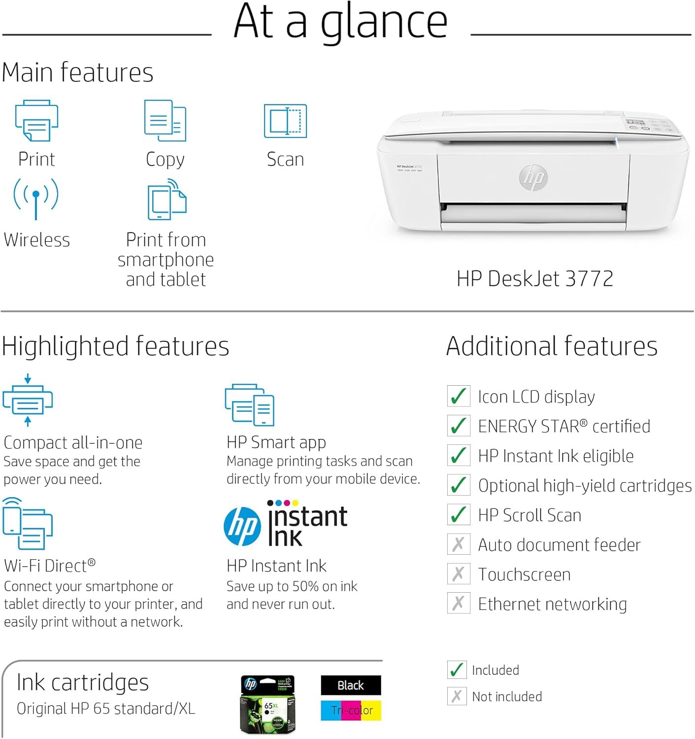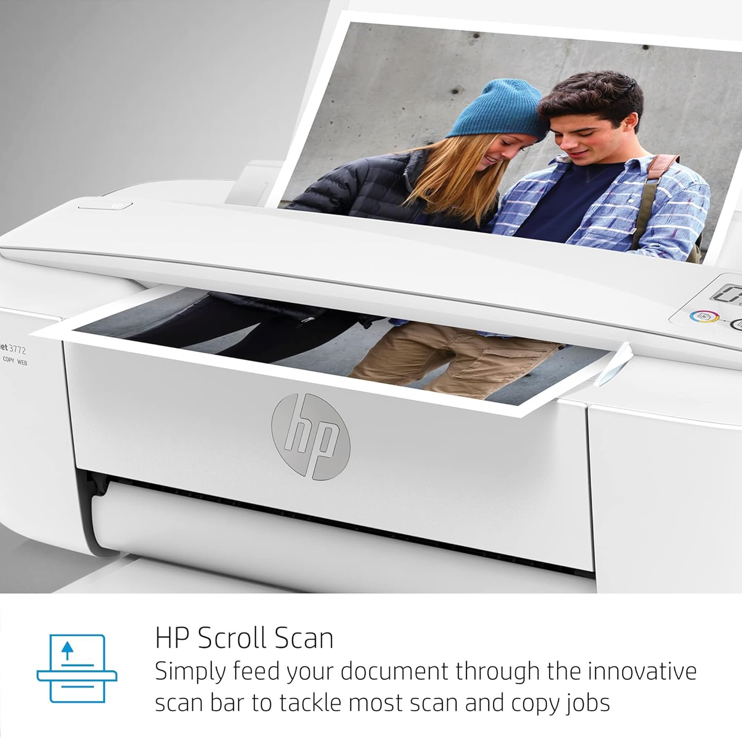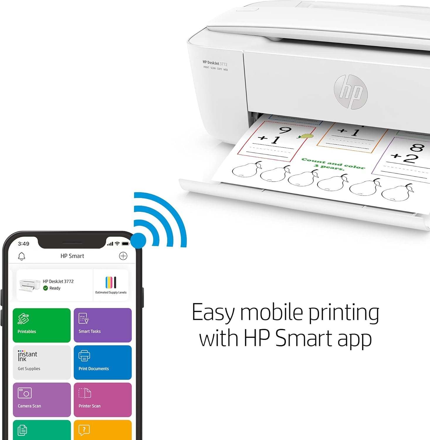 HP DeskJet 3772 All-in-One Color Inkjet Printer Scanner and Copy, Instant Ink Ready, Wireless Printers for Home and Office, Photo Print, Built-in WiFi, T8W88A (Renewed)