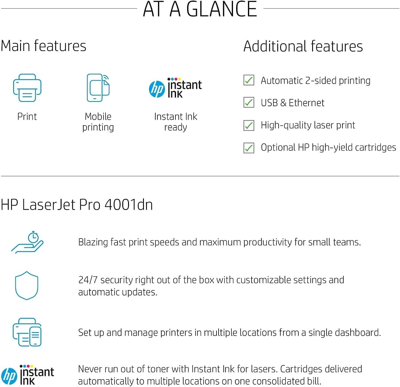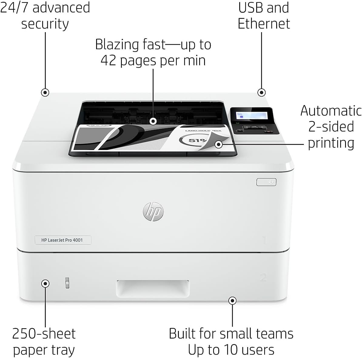 HP LaserJet Pro 4001dn Printer, Print, Fast speeds, Easy setup, Mobile printing, Advanced security, Best-for-small teams, Ethernet/USB only