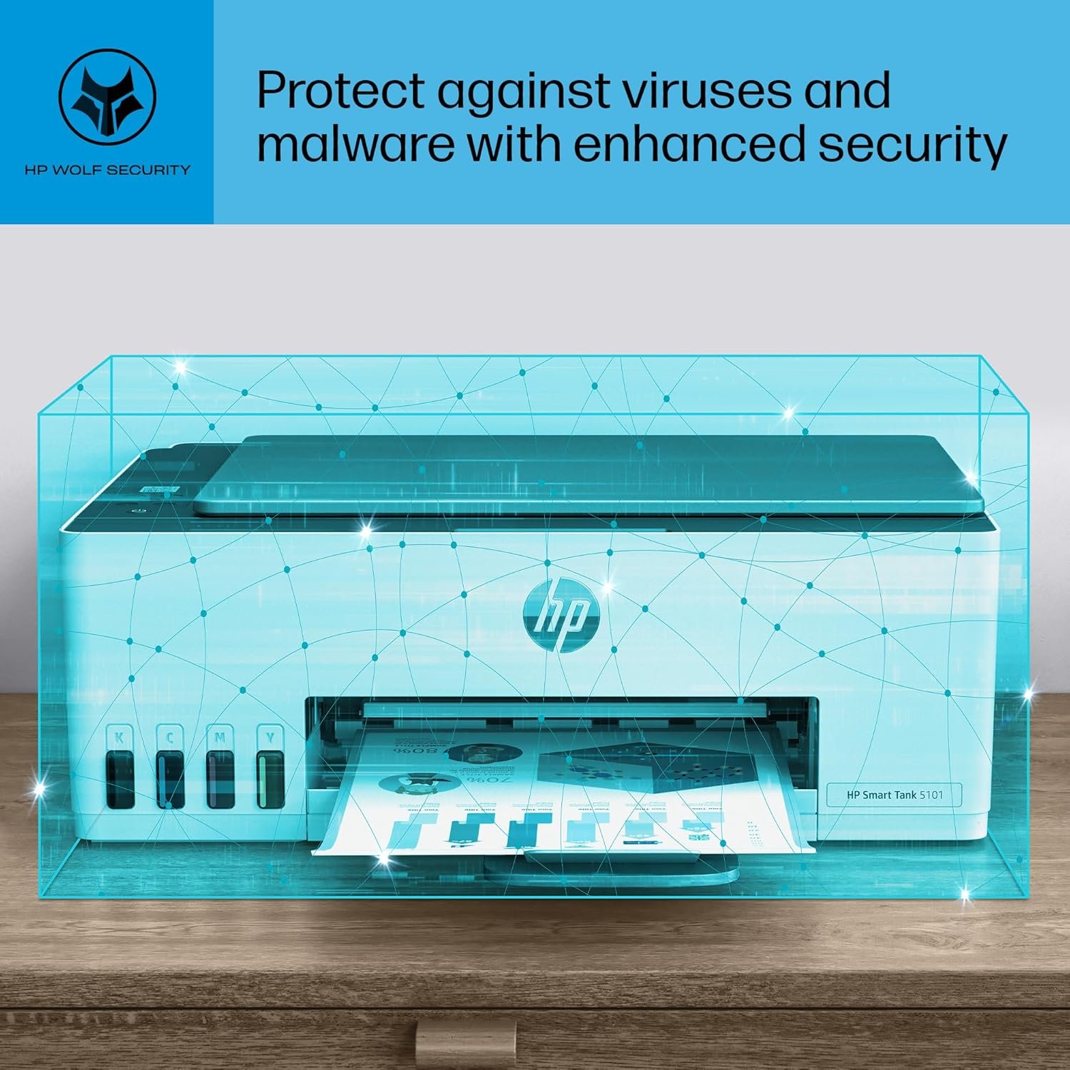 The HP Smart Tank 5101 Printer is a smart, connected and refillable tank printer that makes printing seamless for your home with its high capacity and wireless connectivity. Create everyday color documents at a low cost with 2 years of Original HP Ink included in the box. This Smart Tank printer is an inkjet perfect for high-volume printing.