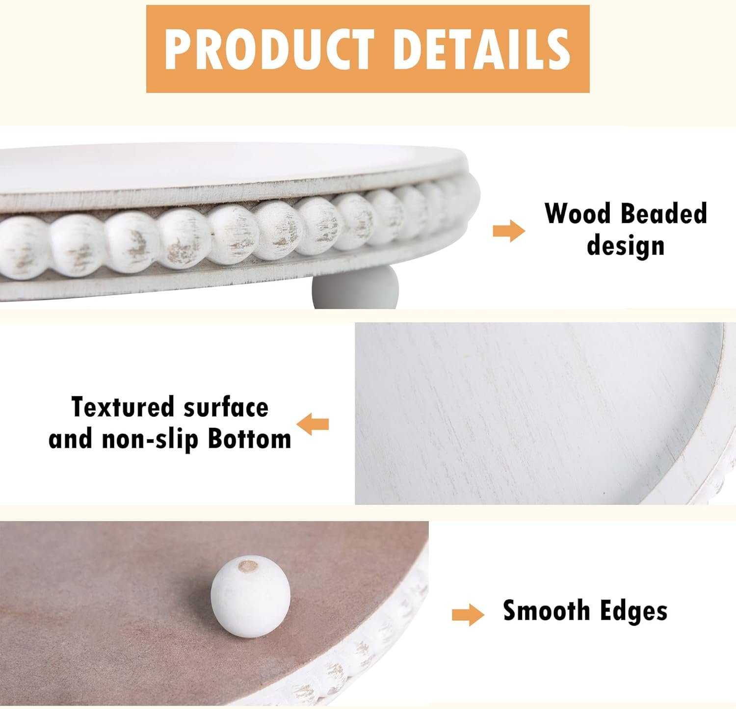 【Package Include】: You will receive a 12 inch round wood beaded tray , which has a farmhosue boho style to meet your decoration needs. The total height is about 2.12inch, including 1.12inch ball foot height and 1 inch tray height.
