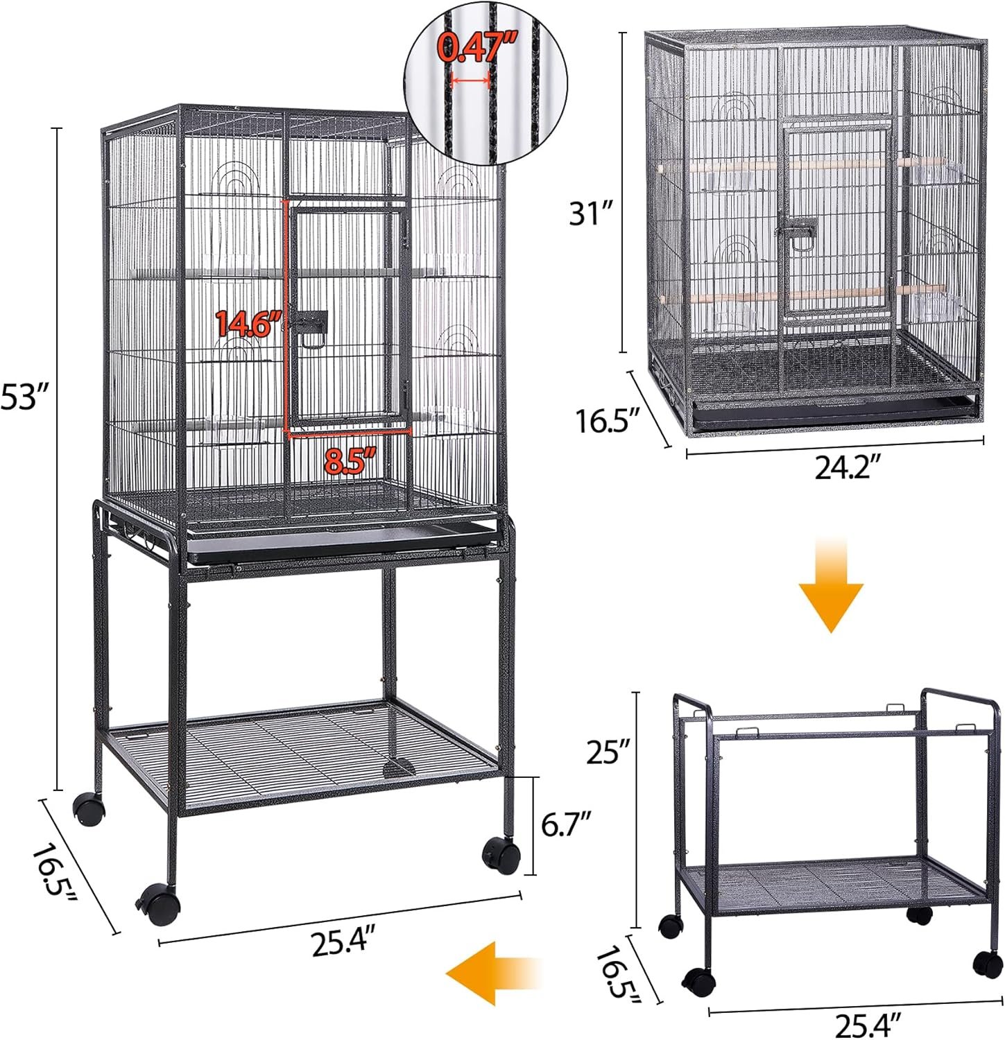 【Wide Use】This bird cage with stand is the ideal size for Caciques, Conures, Jardine’s Parrot, Meyer’s Parrots, Pionus, Poicephalus, Red-bellied and other similar size birds to perch and live comfortably.