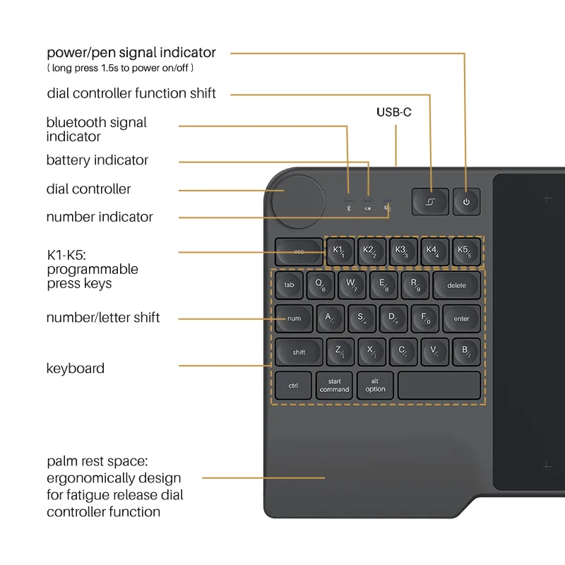 1. KD200 is the industry’s first Bluetooth 5.0 digital tablet with keyboard and dial functions.