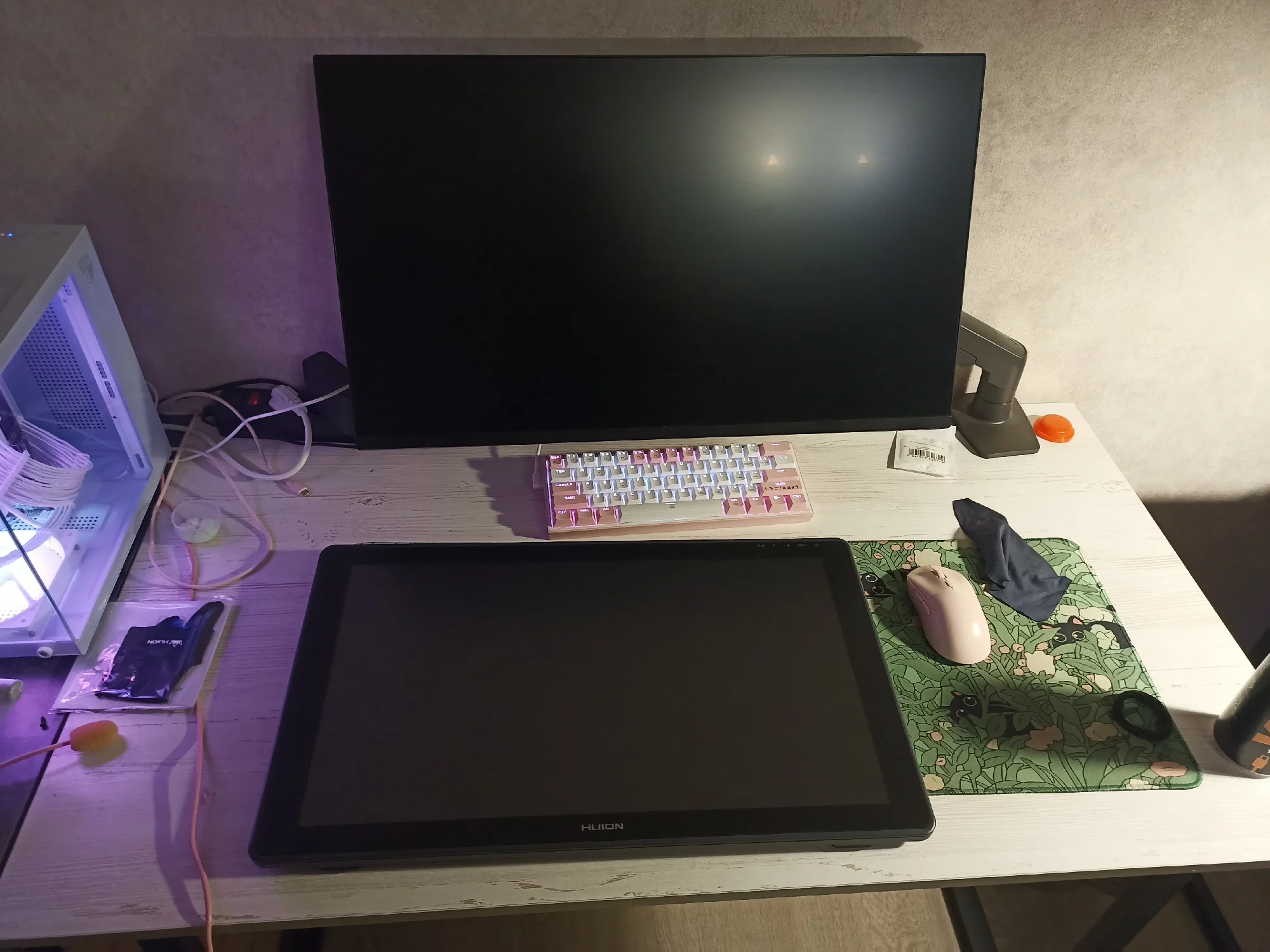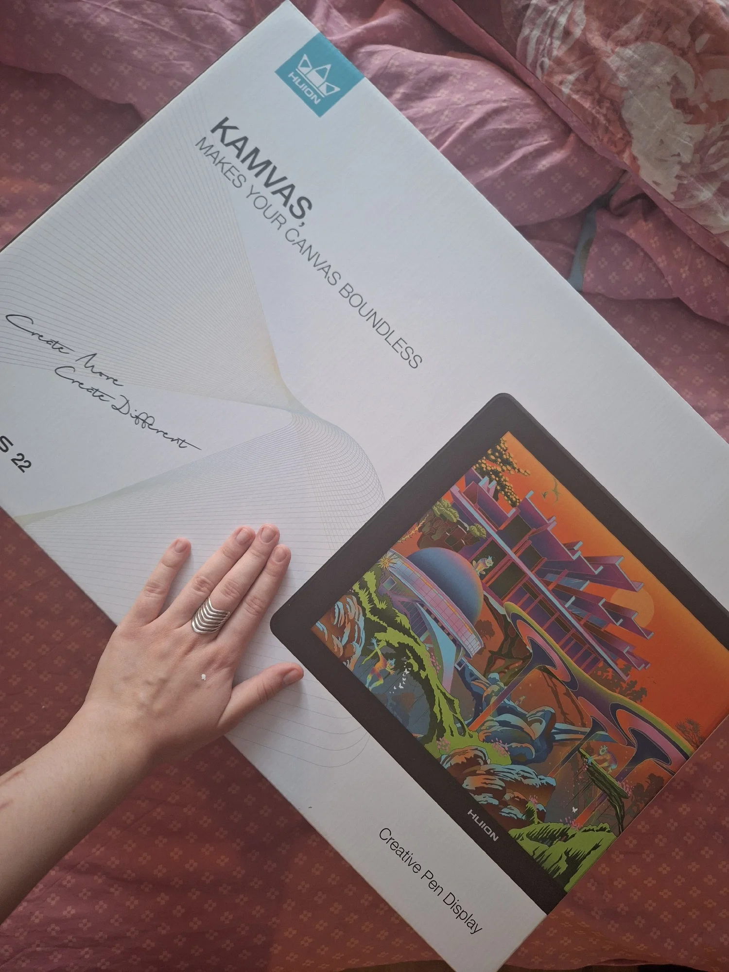 Arrived in Ulyanovsk in 6 days. Set up quickly, all components are in place. No defects. Adjusted the color settings a bit, calibration settings are very convenient. The pen also fits comfortably in hand and the glove is excellent for a woman’s hand. Connects conveniently, the stand also has a good range of tilt angle adjustment. Drivers automatically switched to Kamvas (not my first tablet from Huion).