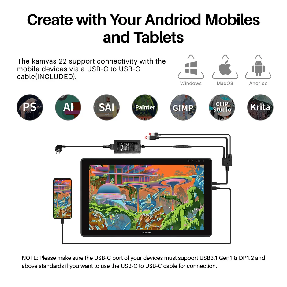 2, Full-featured USB-C Port (DP Signal): Connect your pen display to computer or Android phone via a full-featured USB-C to USB-C cable, and a 3-in-1 cable for extra power supply.