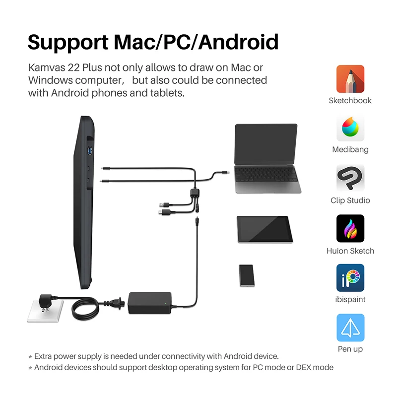 Full-featured type-C cable compatible with power cable of the 3-in-1 cable turns your Android mobile devices to the heart of the Kamvas 22 Plus