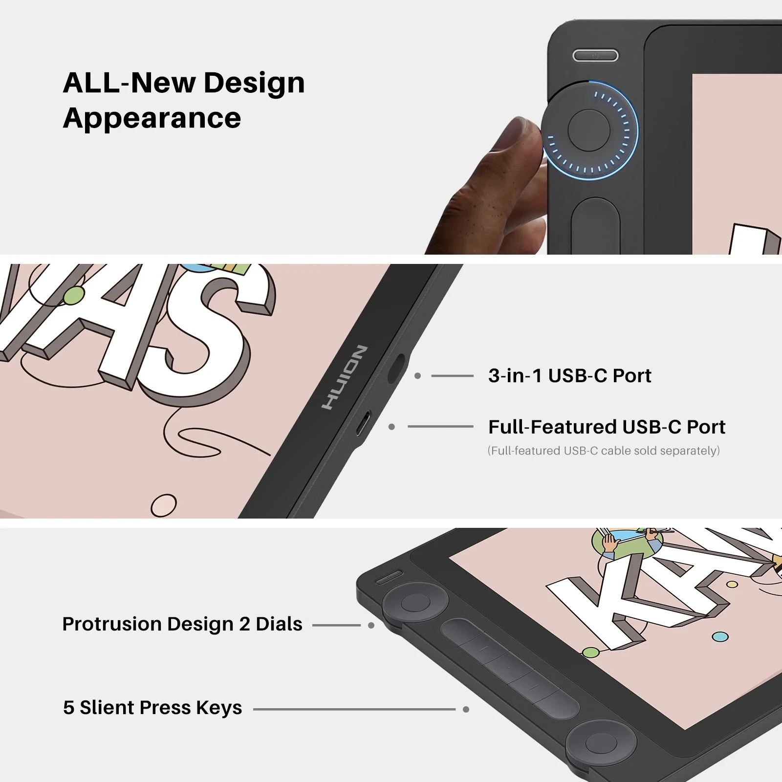 Kamvas 13 (Gen 3) is equipped with 2 dial controllers and 5 silent press keys, allowing you to precisely adjust canvas, brushes, sliders, flow, opacity, frames, parameter sliders, and more.