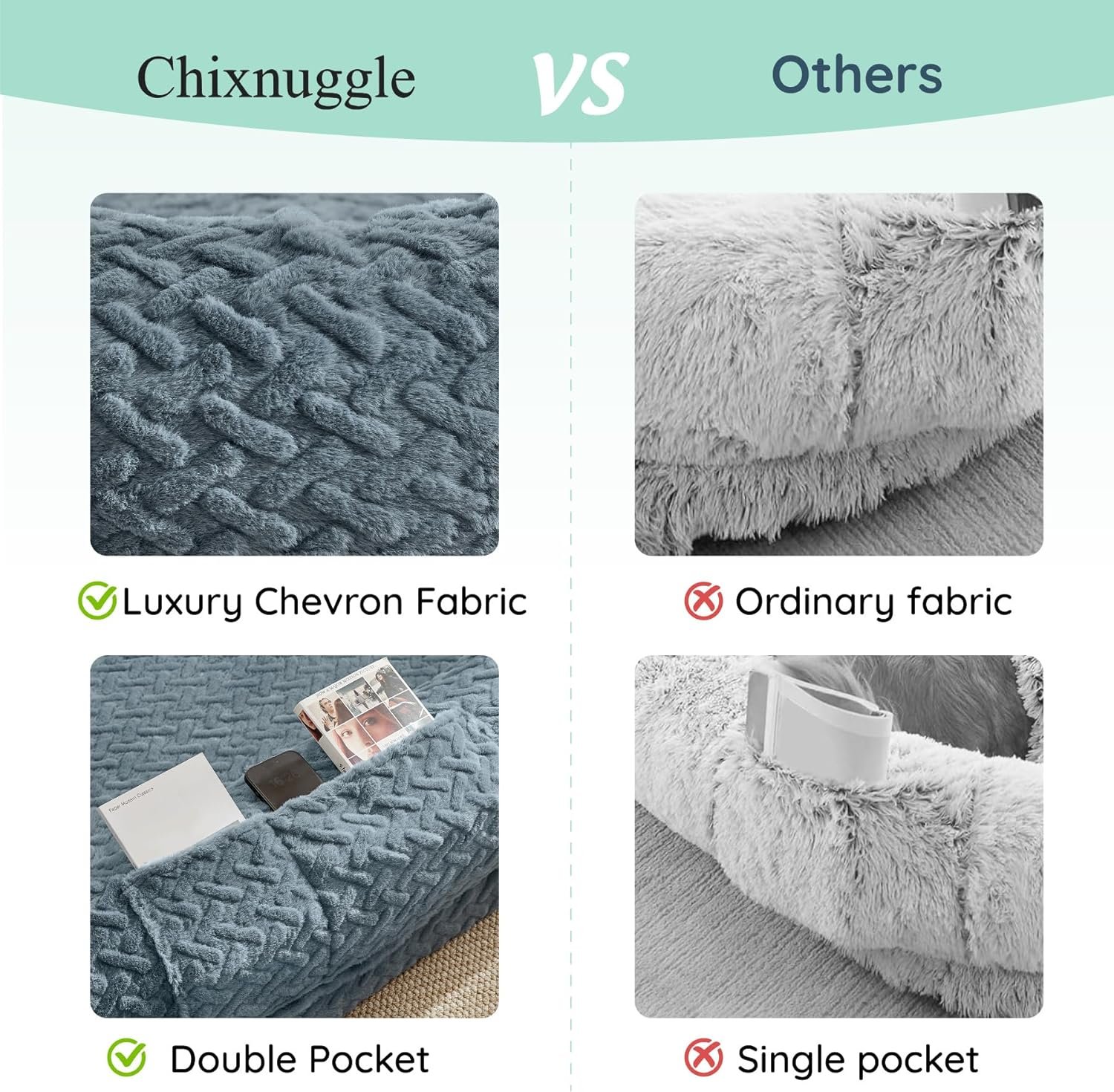 ChiXnuggle Unique Features: Featuring ultra soft chevron fabric and a cozy, durable blanket. Stay organized with 2 convenient side pockets for your essentials. Easily store this extra large bed with the included strap.