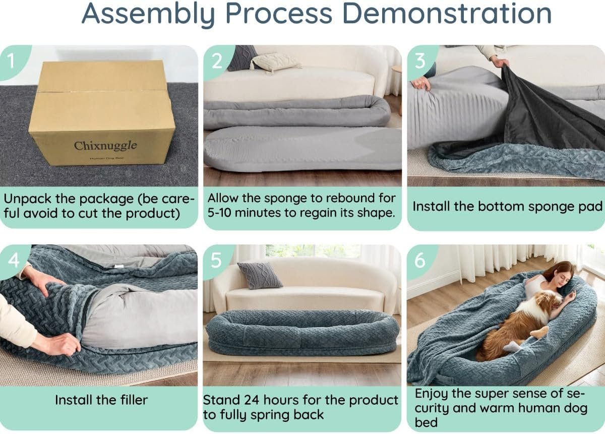 Wash & Care: Simply unzip, remove filler, and machine wash the bed cover. Important Notice: Our human dog bed is vacuum-compressed for shipping. After completing the installation, please allow a minimum of 24 hours for the bed to regain its shape.