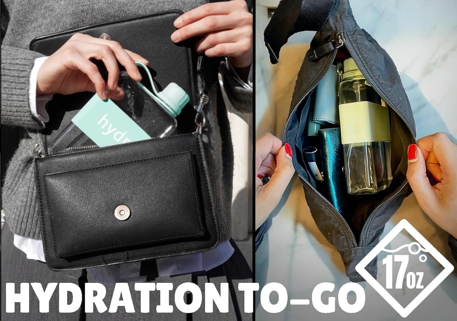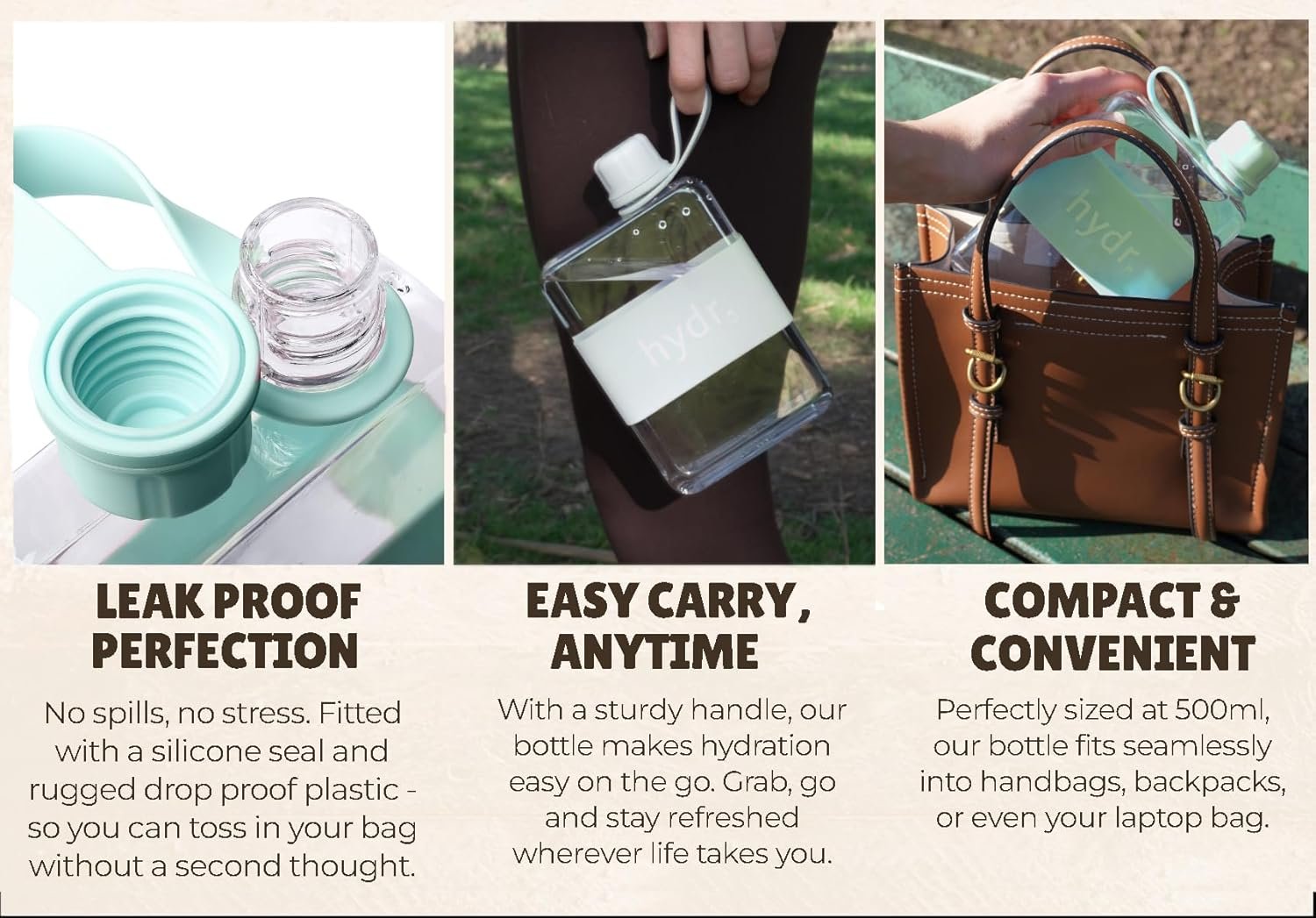 Perfectly sized at 500ml, our water bottle thin fits seamlessly into handbags, backpacks, or even your laptop bag.