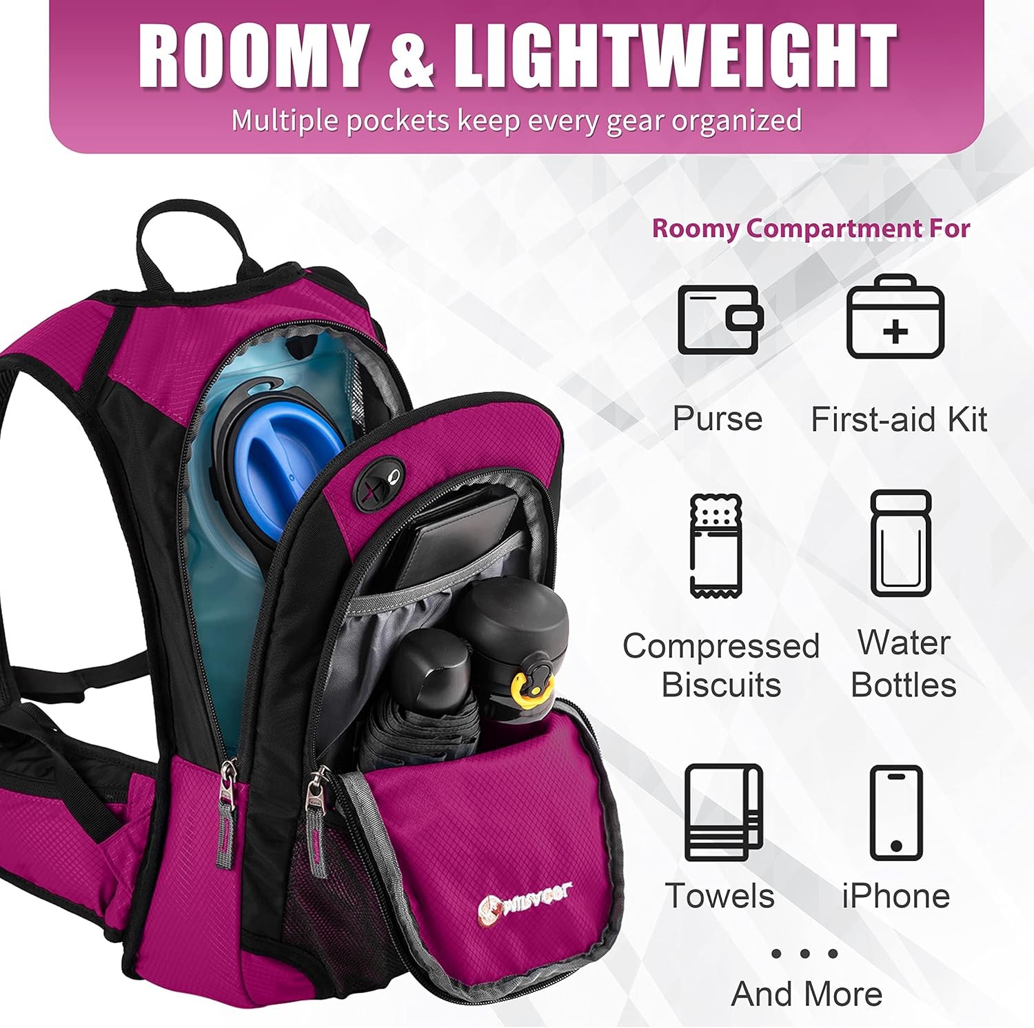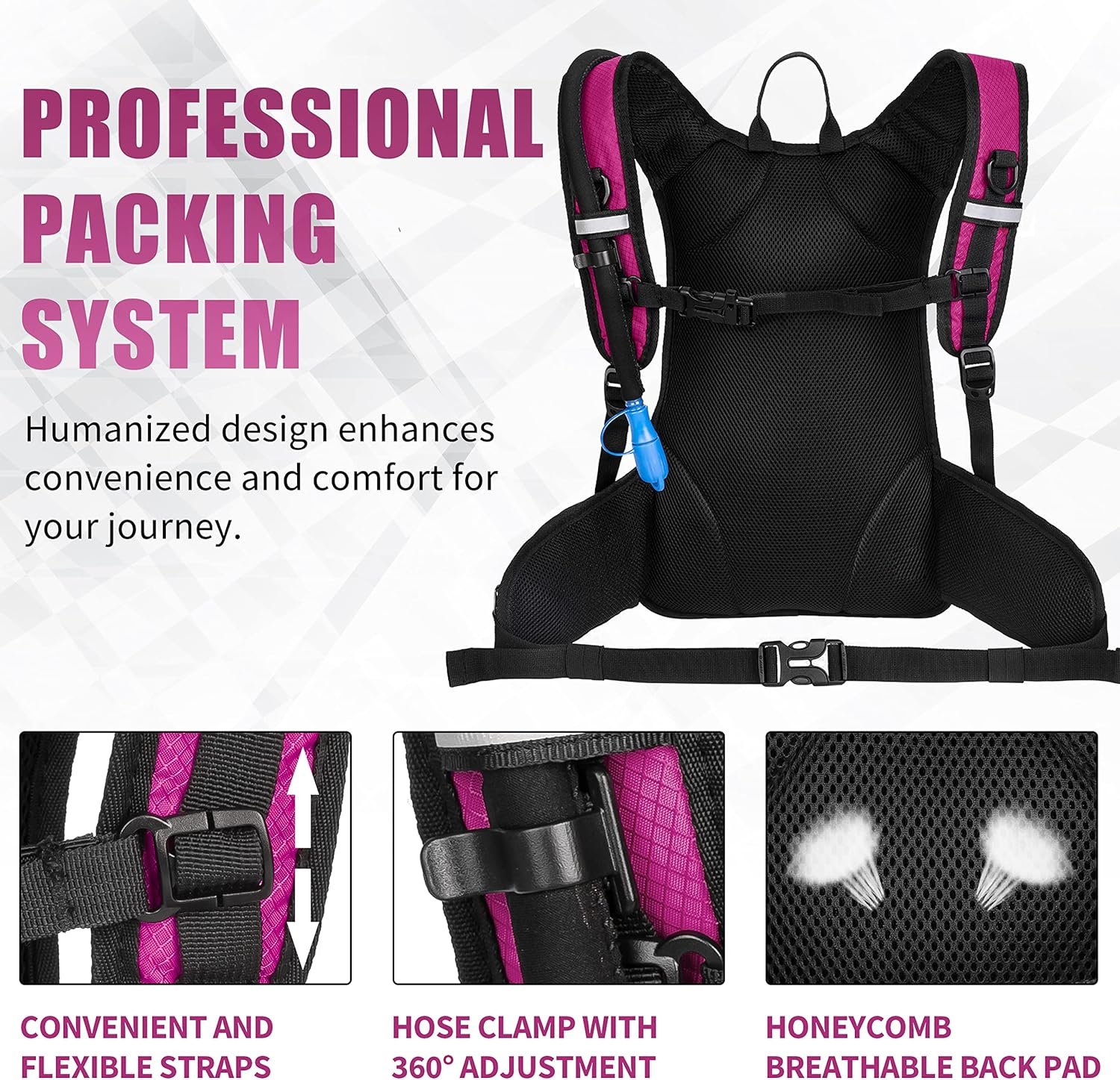 Hiking Optimized Design: This hiking hydration backpack with bladder is purpose built for hiking outdoor adventures, featuring a dedicated compartment to securely hold the included 2L water bladder. The leak-proof and taste-free water bladder ensures a clean and pure drinking experience, while keeping your gear dry and protected.