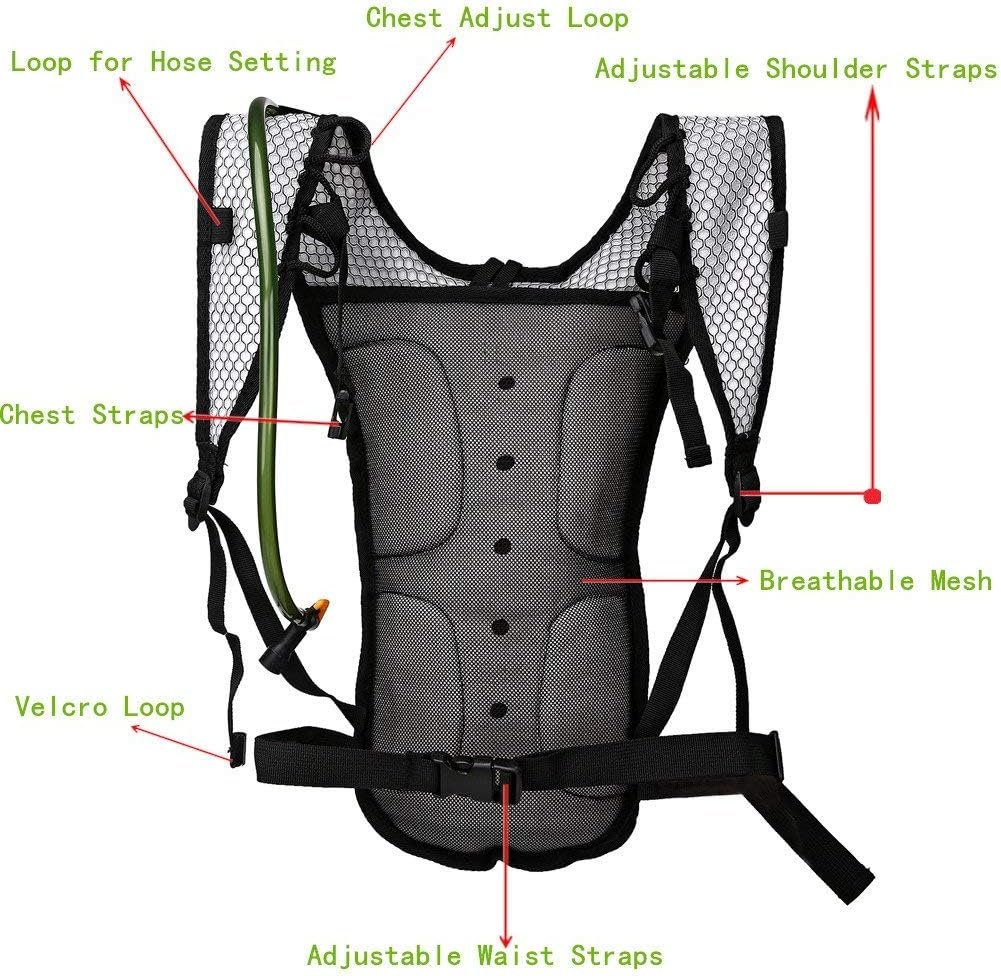 ●WILL FIT YOU PERFECTLY: Adjustable shoulder/chest /waist straps. The Shoulder/chest /waist straps makes sure it doesn’t bounce when you move. The straps is made of strong nylon material, Wearable,durable . Suitable for accommodating 1.5 L and 2 L of the water bladder.