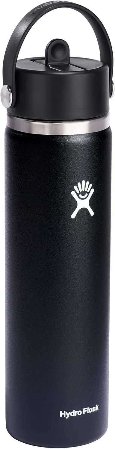 24 OZ BLACK BOTTLE: Flip it and sip it with the Hydro Flask Wide Mouth insulated water bottle with closeable straw cap. With a comfortable, flexible handle, the leakproof straw cap is easy to open and close with one hand, for on-demand hydration. Double-wall insulation keeps drinks cold up to 24 hours for cool refreshment.