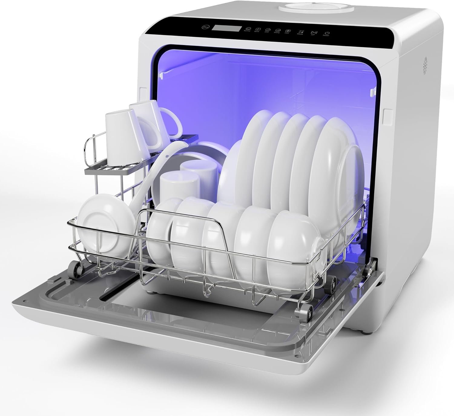 Multi-Purpose & Easy To Use: The dishwasher can not only wash dishes but also wash fruits and vegetables. Touch the screen switch to select 1 of 6 cleaning programs(DRY, Normal, Quick, ECO, Strong, Fruit), after the start, the machine will automatically run until finish the washing.