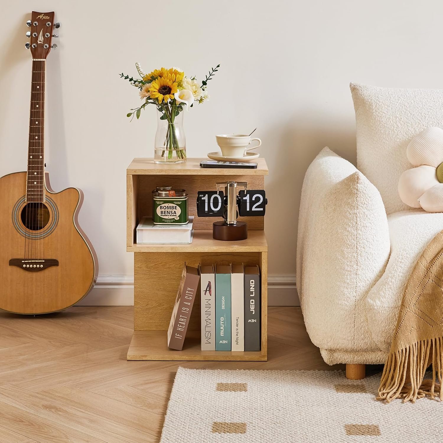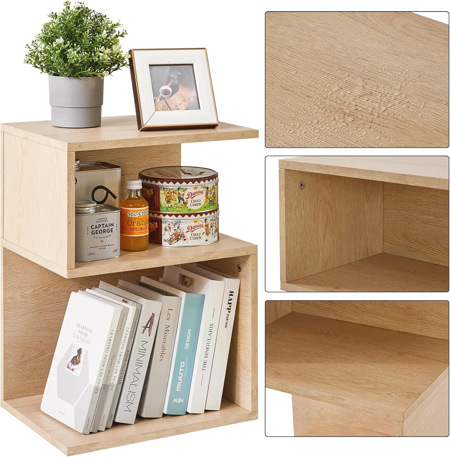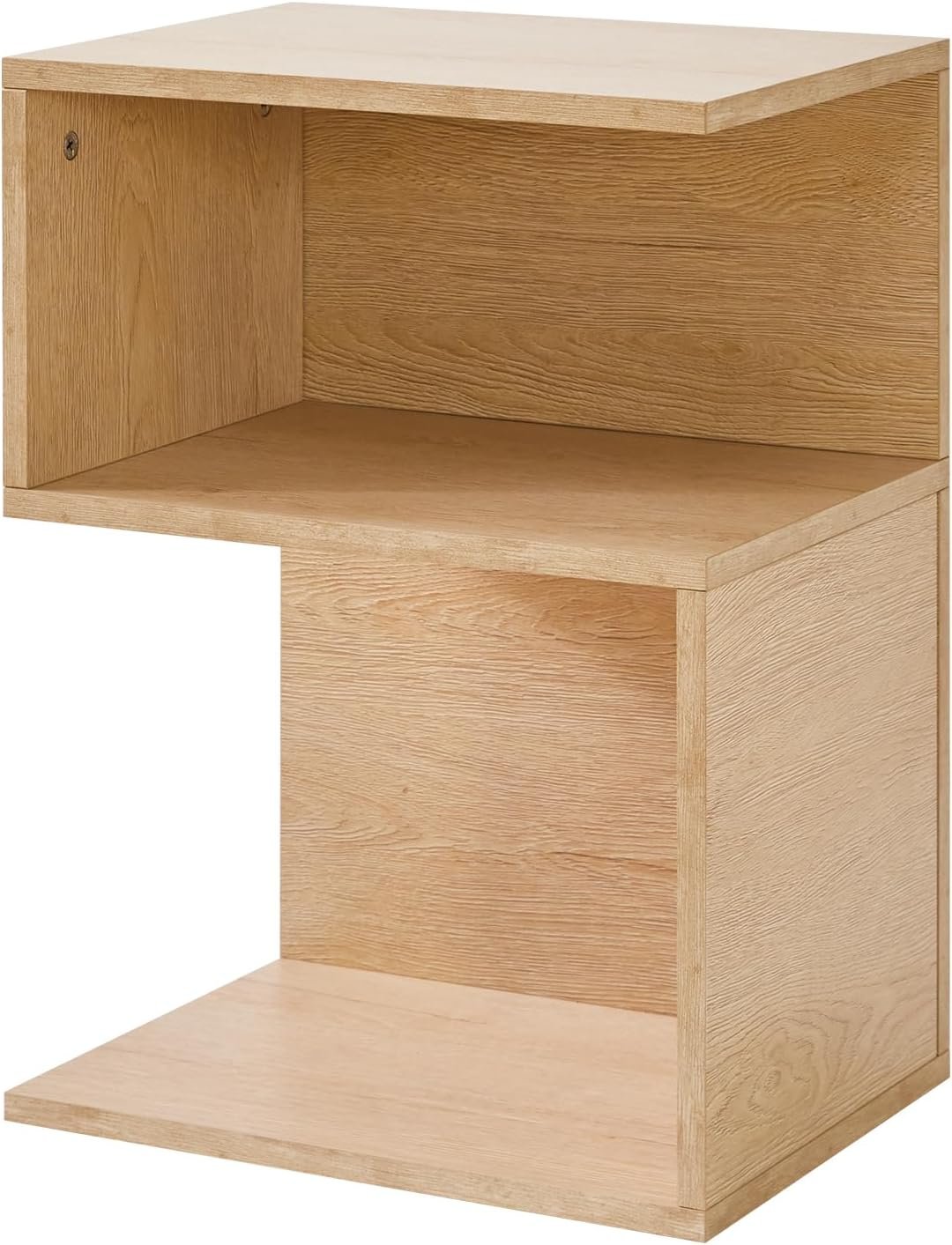 IBUYKE S-Shaped Nightstand, 3-Tier Wood Nightstand with Open Storage, Minimalist End Table for Small Spaces, Easy Assembly, Bedside Table for Bedroom, Natural UWST004R
