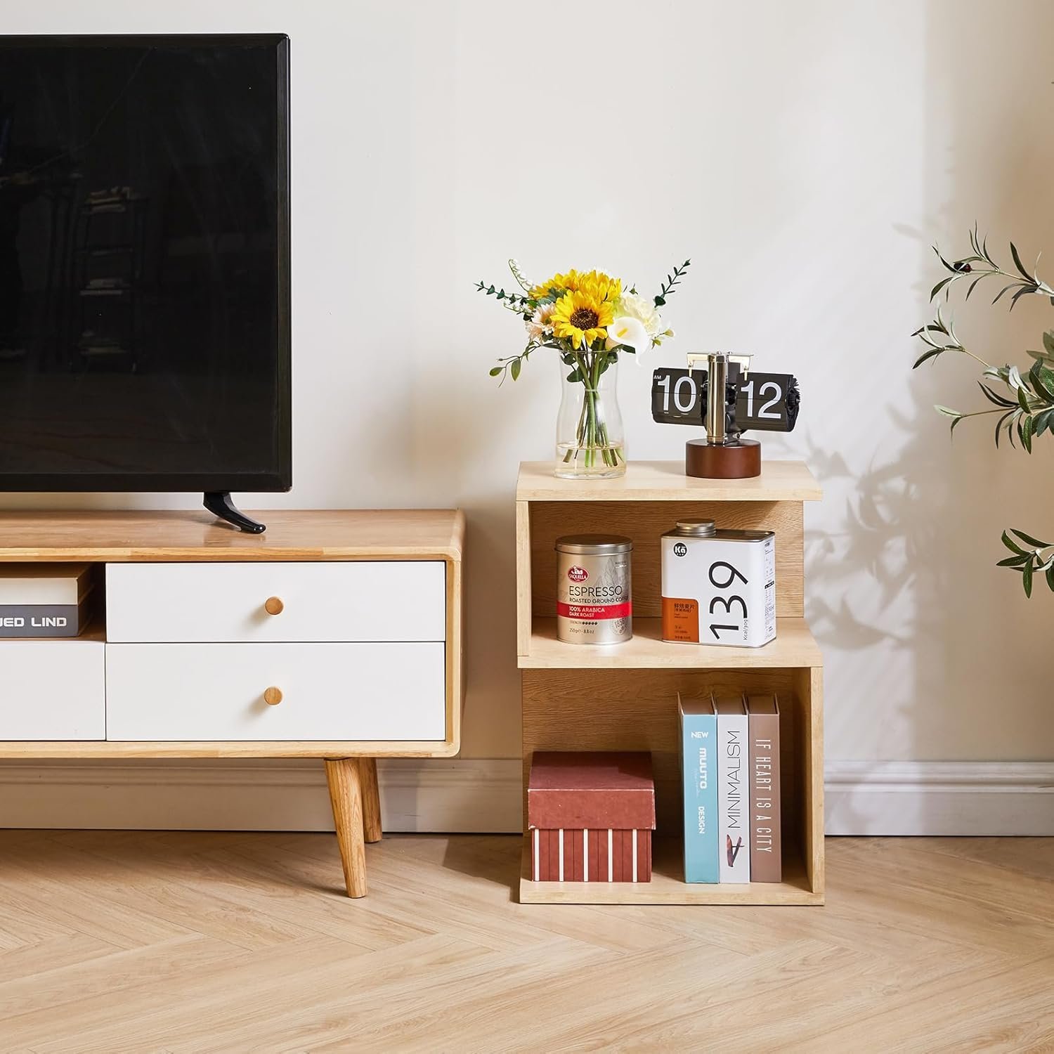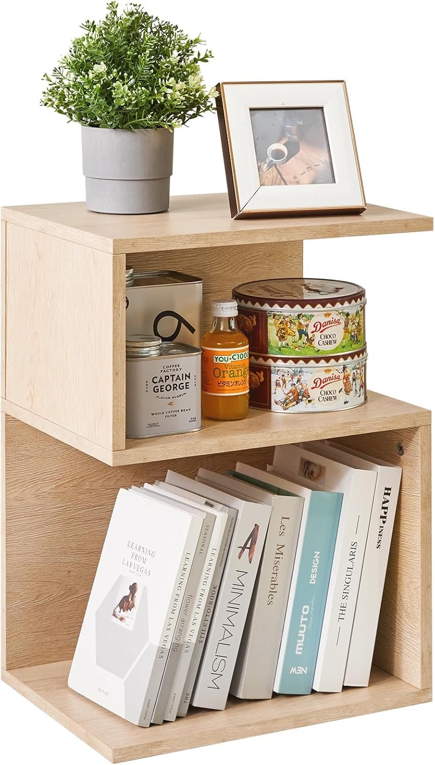 The unique S-shaped design adds a touch of elegance and versatility, allowing for storage next to your TV. The spacious top and 2 open compartments provide ample storage space