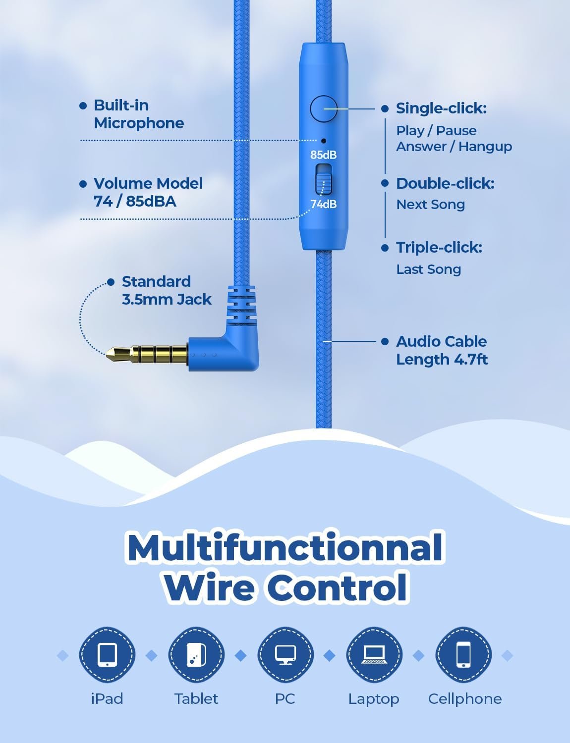 【Built-in Microphone & Great Compatibility】: iClever wired headphones work with the In-line microphone making them perfect for Online Courses and Voice calls. These Over-Ear headphones support devices with 3.5mm audio jack like Chromebook, Kindle Fire Tablet, Switch, iPad, Laptop, PC etc.