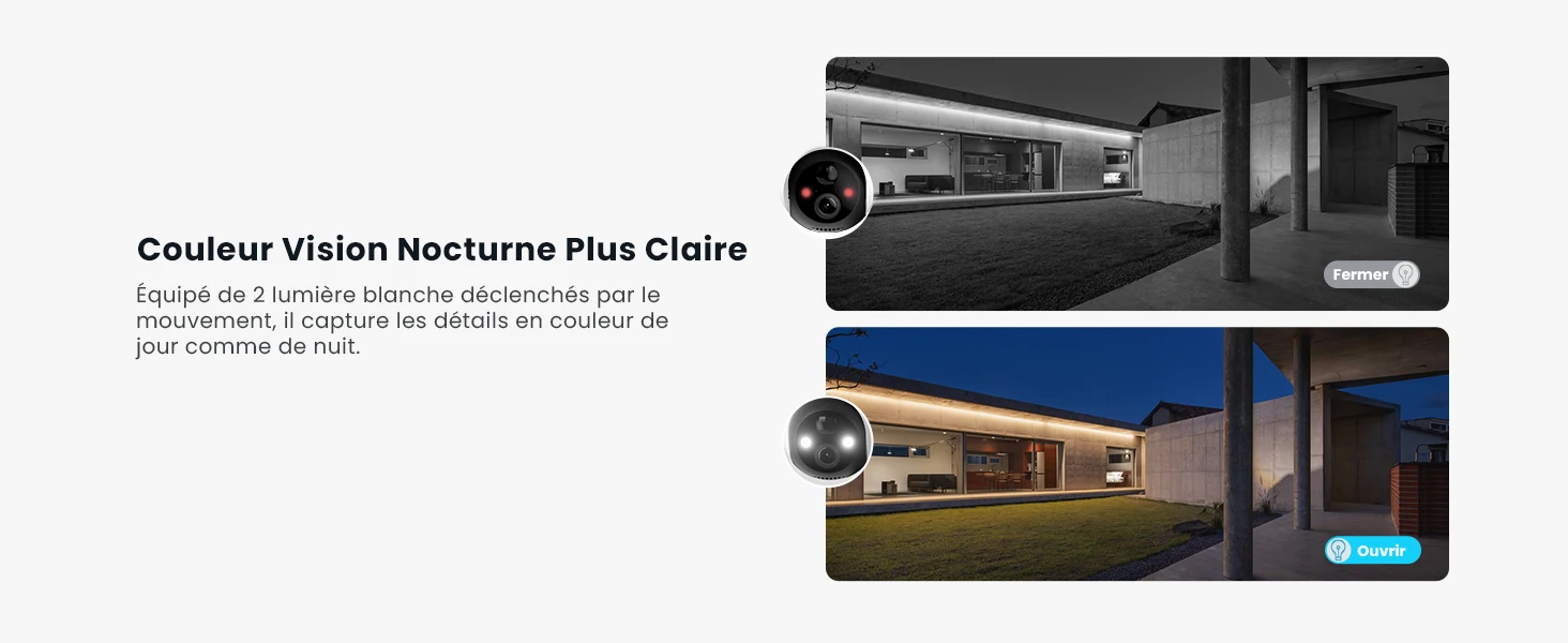 ã€PIR Human Detection and Intelligent Alarm】Solar camera uses improved AI algorithms to greatly reduce false alarms caused by flying insects, fallen leaves, etc. In case of night detection, the camera automatically triggers an alarm (sound/white light/sound and white light) to deter intruders. At the same time, your phone will receive a message notification within 1.5s to keep you informed of the situation in your home