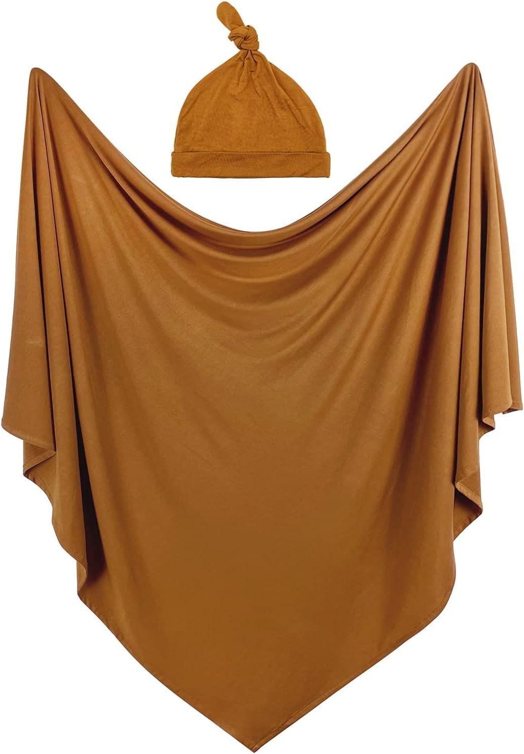 iEvolve Cotton Knitted Baby Swaddle Blanket with Hat Headband Set Newborn Swaddle Wrap Receiving Blankets for Baby Girl Boy 35″ x 35″(Ginger)