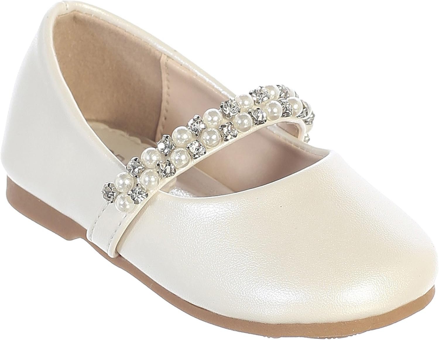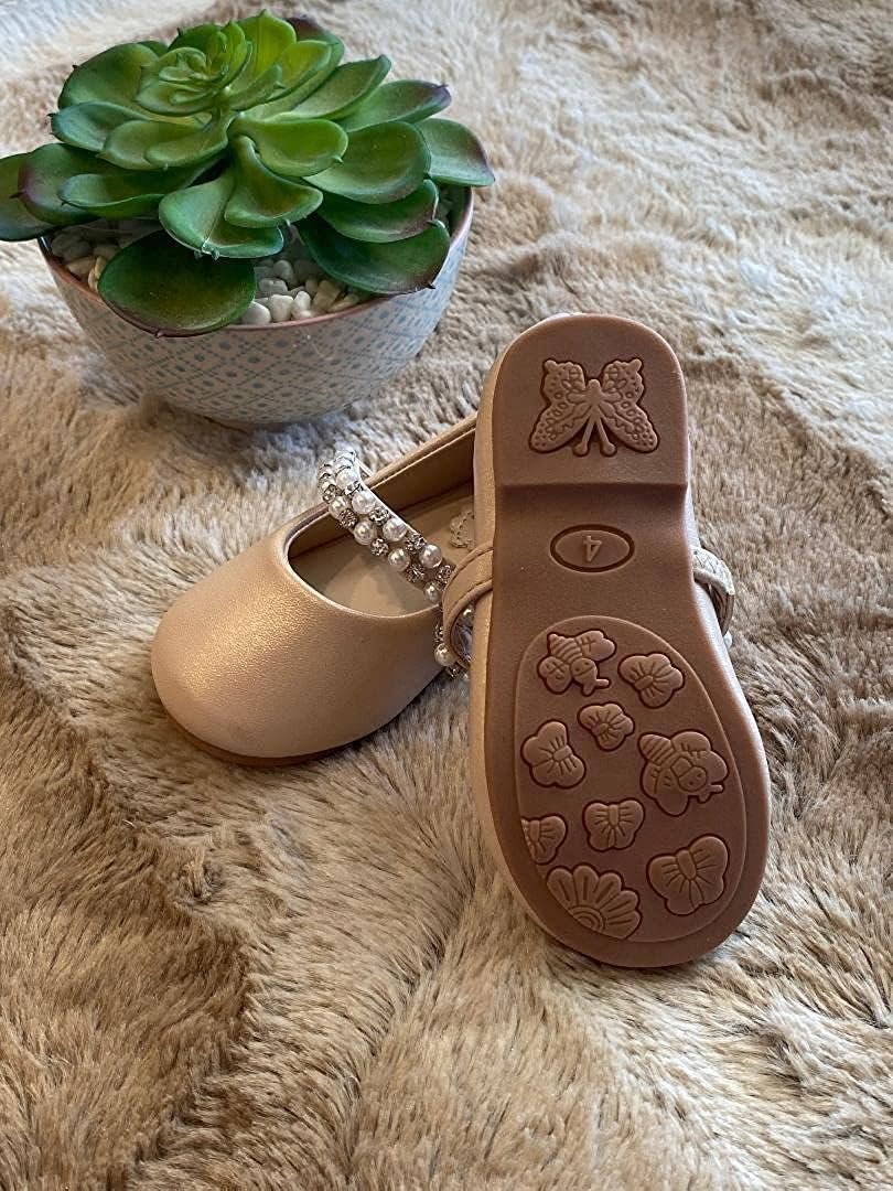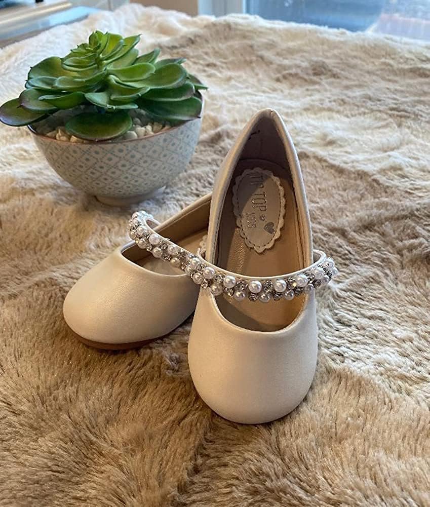 Classic flower girl dress shoes for infant and toddler girl. Flower Slip on Flats . Strap w/ flower rhinestones or pearls. Treaded outsole for sure footing.