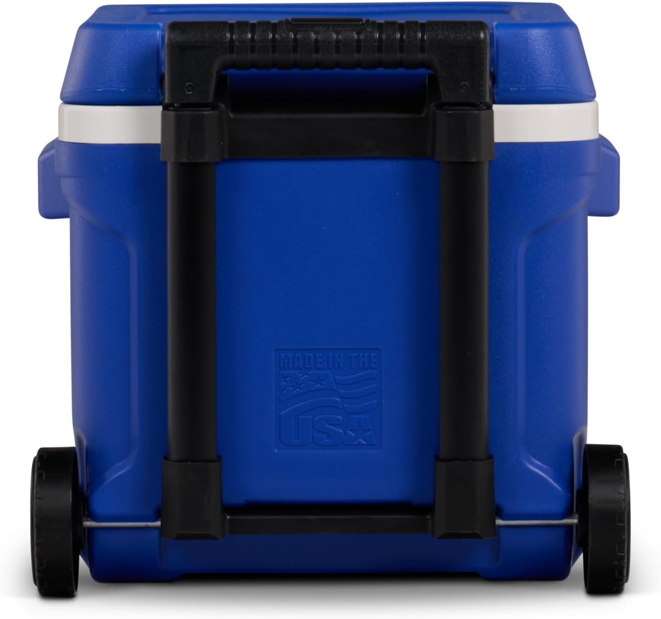 Wheeled for easy transport and locking telescoping handle enables cooler to be pushed or pulled