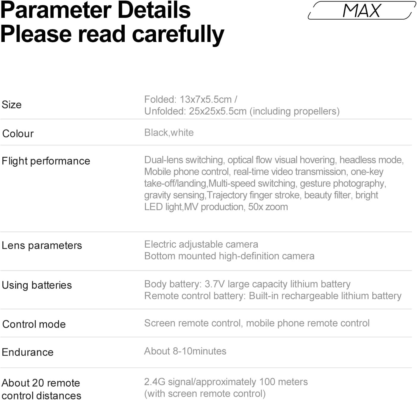 Size Floding:13x7x5.2cm / Unfloding:25x25x5.5cm (including blades) Flight system Optical flow visual positioning hovering/dazzling design Flight function Dual-camera switching, Mobile phone control, Otical flow positioning, Real-time video transmission, Bright LED light, gravity sensor, Multi-zoom, Beauty shooting, Trajectory fingering, One-key take-off and landing/return to home, Headless mode, 360° rolling, MV production, Speed switching Lens parameters Front facing lens(90° manual adjustment)+ bottom facing lens Using batteries Body battery: Modular lithium battery Remote contorl battery: Built-in rechargeable lithium battery Control mode Screen remote control, Handle remote control, Mobile phone remote control (aerial version only) Endurance Approximately 8-10 minutes Flight distance About 80 meters