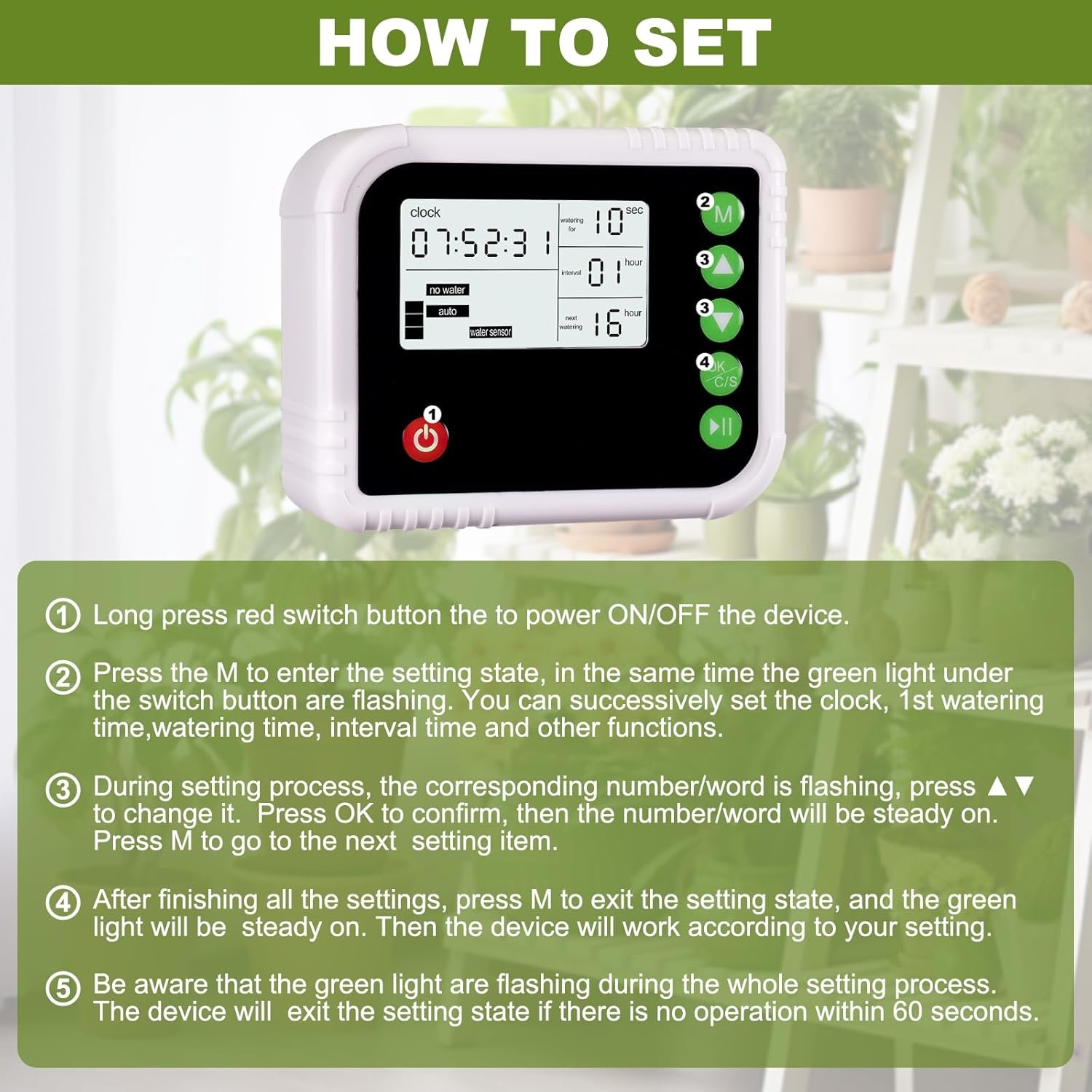 LED SCREEN INTERFACE: The automatic watering system is equipped with a user-friendly LED screen, simplifying setup and programming. This advanced display allows you to easily monitor watering duration, schedule, and battery level. Allow you to easily water plants.