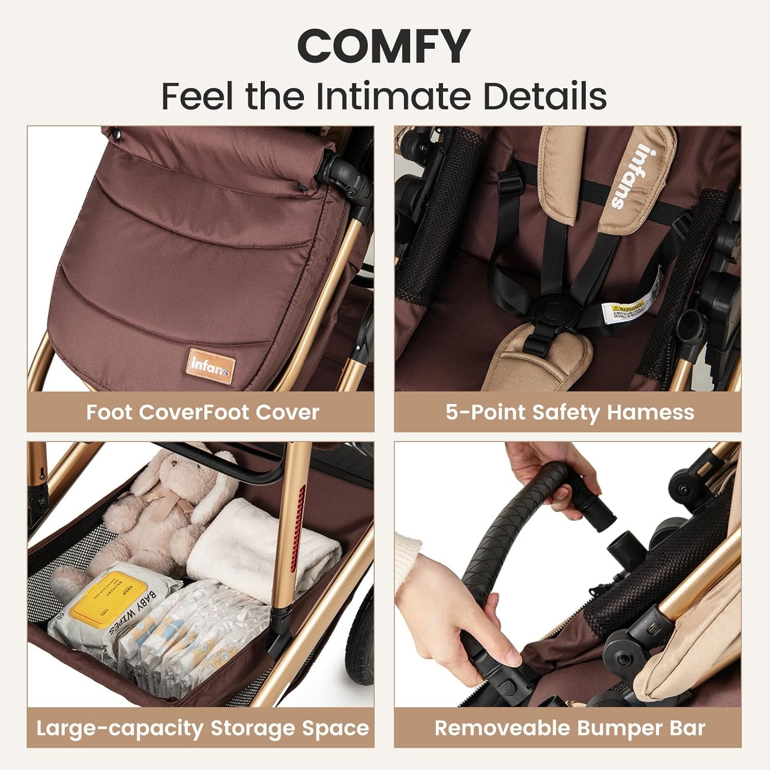 2 In 1 High Landscape Convertible Stroller: INFANS infant stroller is specially designed to meet the different needs of babies as they grow up. The basket can be adjusted to 2 modes. When the basket is facing the parents, the parents can take care of the baby at any time and pay attention to the baby’s movements. With the basket facing out, baby can enjoy the scenery outside.