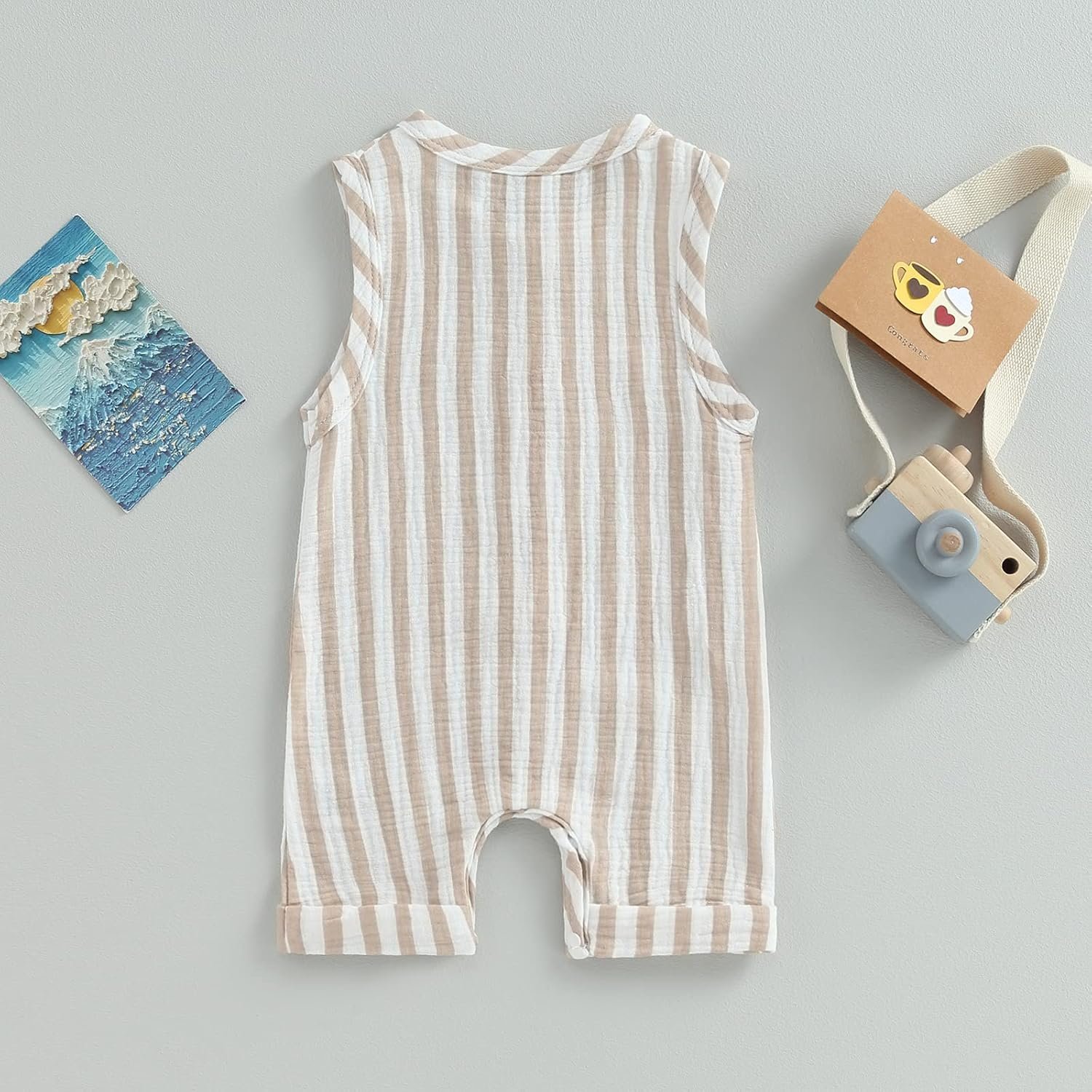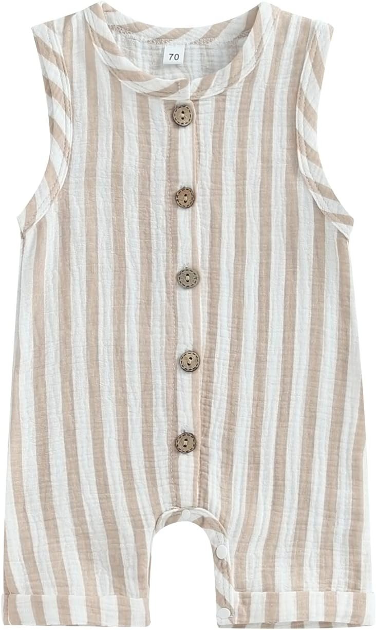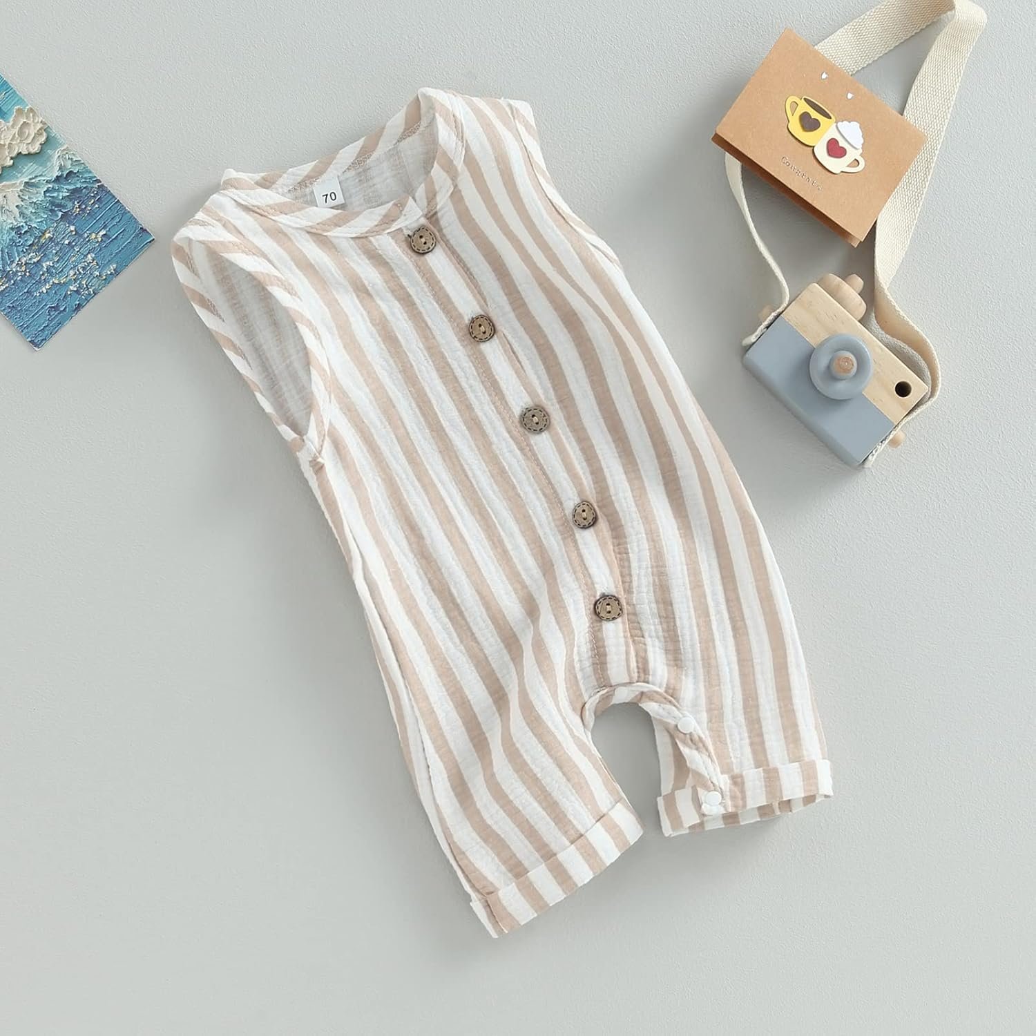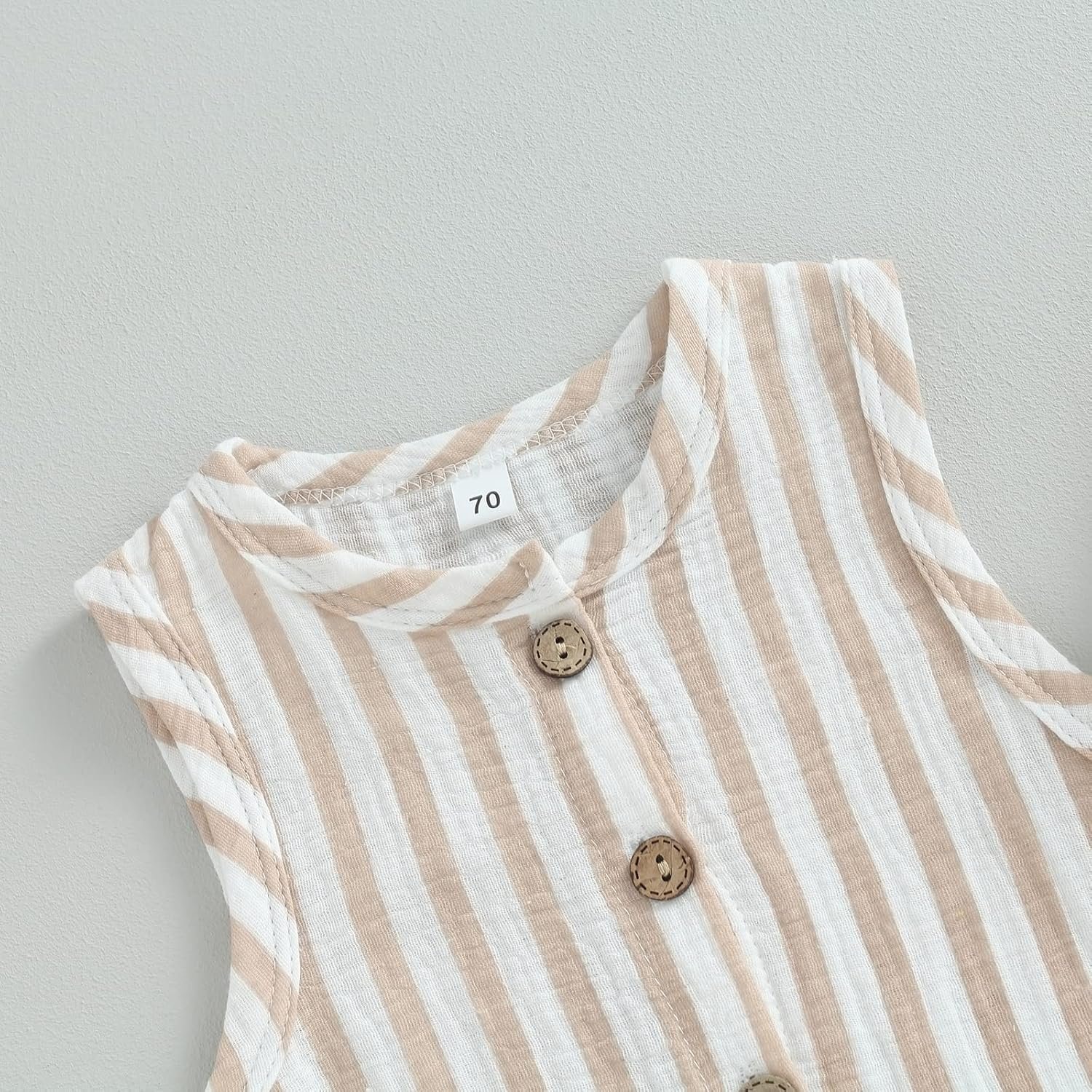 Unisex baby one pieces outfits features sleeveless, crew neck, button closure, classic stripes pattern