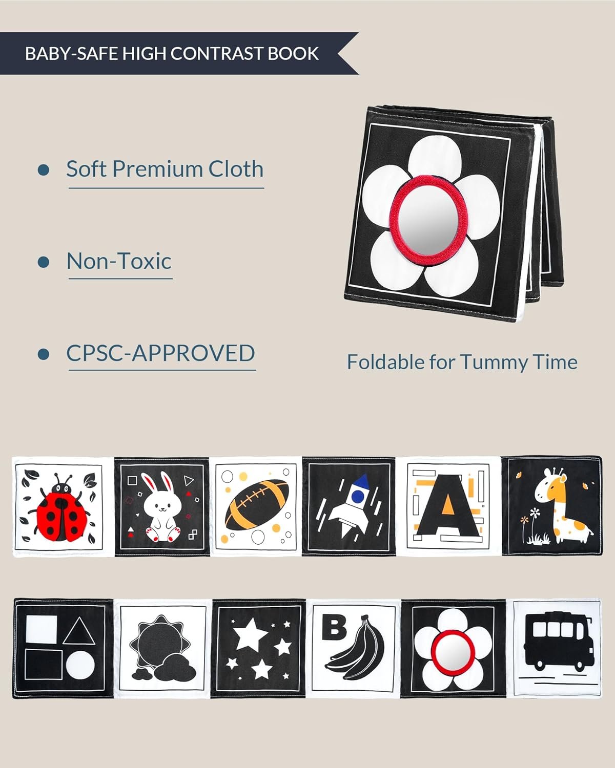 Versatile & Portable Tummy Time Toy: With four pairs of sturdy ties, this book can be easily hung in a crib, attached to a stroller, or used during tummy time. Its foldable design makes it a convenient travel companion, perfect for keeping your baby engaged whether at home or on the go.