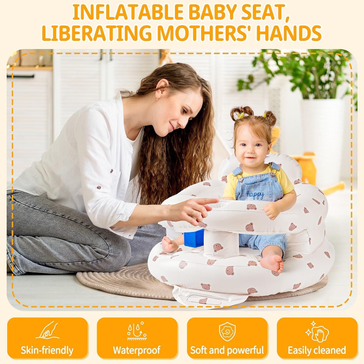 Inflatable Baby Seat for Babies 3-36 Months, Sit Up Chair Built in Air Pump Blow Up Infant Back Support Floor Seat for Bebe 3 Months & Up, Large Space Inflatable Baby Chair (Bear-Large)