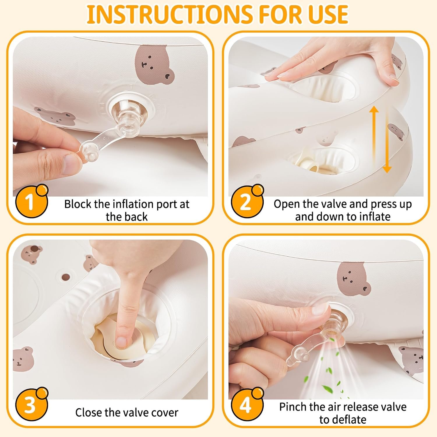 Easy to Use, and Portable: The inflatable baby seat can be easily inflated within 3 minutes by pressing the built-in air pump up and down. Due to the leak-proof design, it is necessary to pinch the air valve when deflating. After deflating, fold it back to a small size for putting away, which is perfect for trips to the beach, camping or park.
