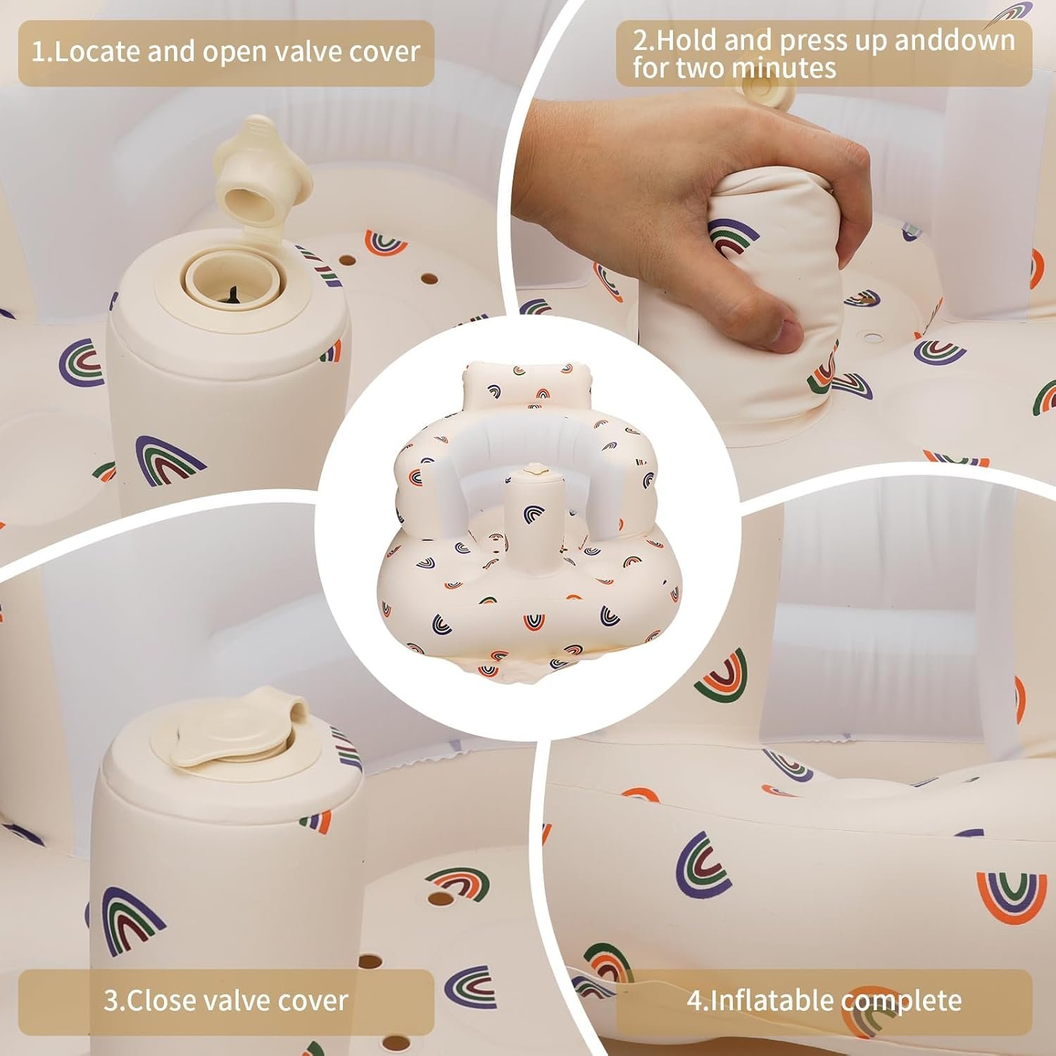【Built-In Air Pump】: With the press of a button, our sit me up floor seat for babies can be easily inflated using the built-in pump, which is designed to be leak-proof for added peace of mind. The valve needs to be squeezed when deflating and the chair is easy to fold and store.
