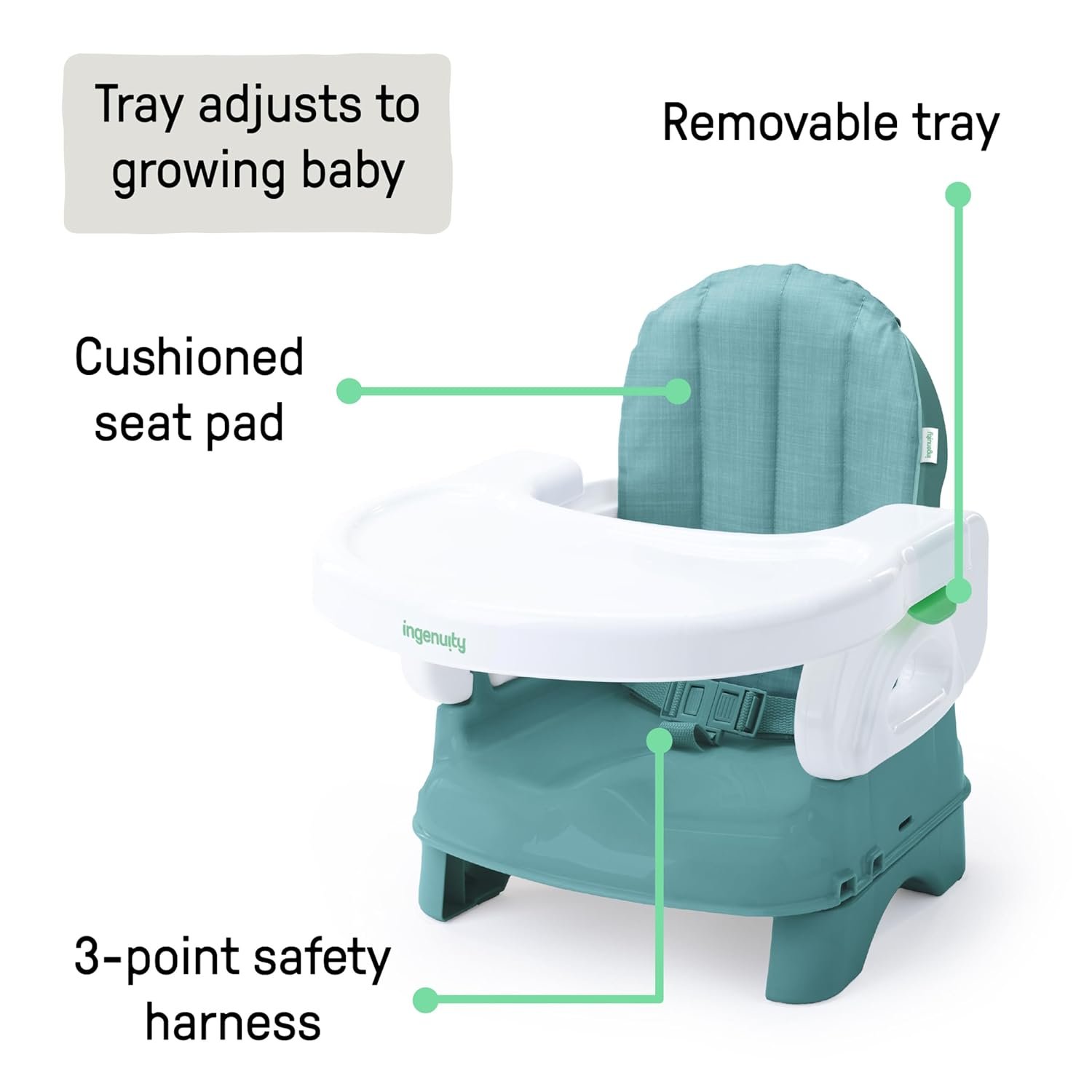 From grandma’s house to your favorite restaurant to weekend trips, the Ingenuity Deluxe Comfort Folding Booster gives your little one a consistent, convenient, and comfortable seat at the table. This booster offers adjustable height positions, allowing it to grow with baby from 6 months all the way to 3 years old. The cushioned seat pad and adjustable tray give your little one comfort and support during mealtime or playtime. This booster also fits perfectly to most dining chairs and has a 3-point harness to keep your child secure. The seat pad and tray are both easy to remove and wipe clean. Straps can be removed and are machine washable. Wherever you go, your little one will be proud to call this seat their very own.