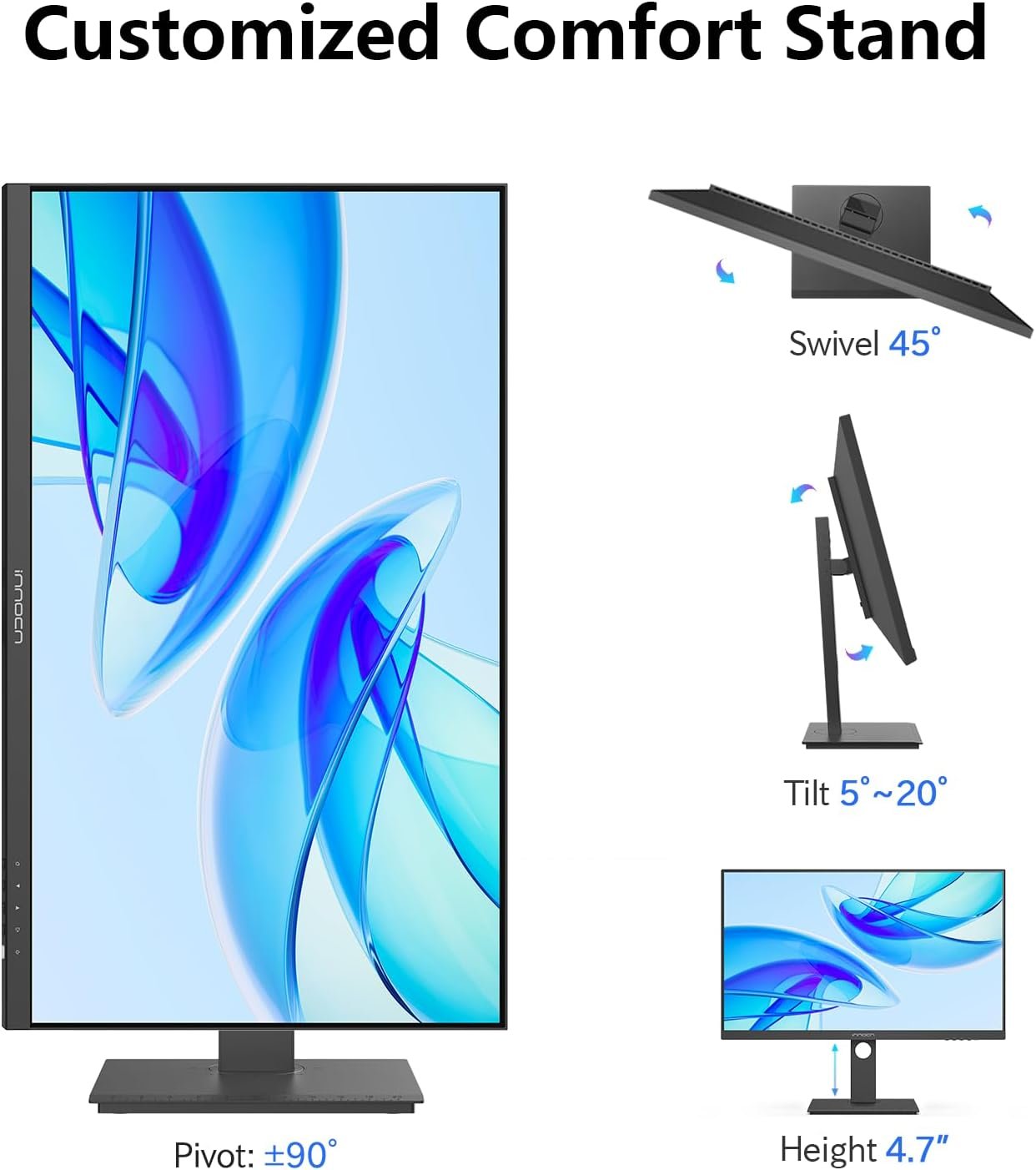【Swivel & Height & Pivot Adjustment】INNOCN 27C1U-D 4K UHD computer monitor come with pivot adjustable stand: left/right: 45°, up/down±5″,Forward: 5°, Backward: 20°, Pivot: ±90°, Ergonomic design for daily usage. VESA wall mountable: 75*75