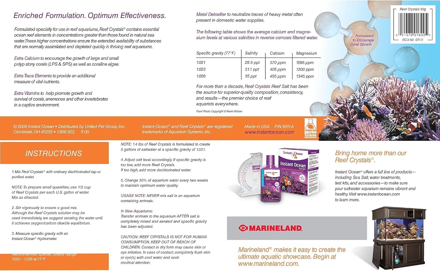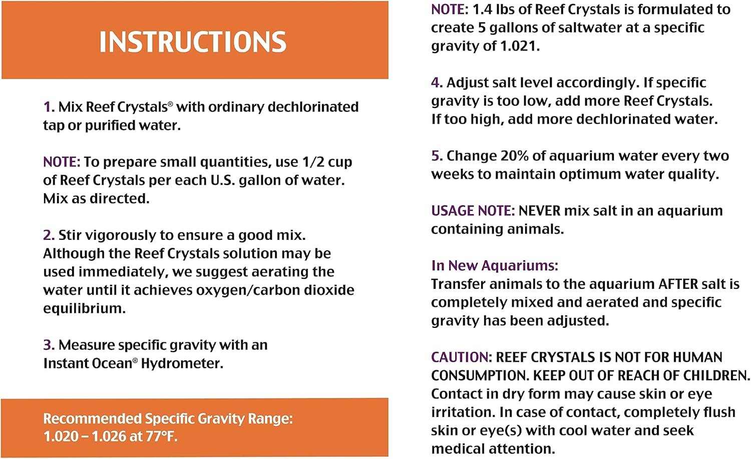 No matter the size of your aquarium, Instant Ocean sea salts and water care products offer the smartest, easiest way to bring the ocean home. Our scientifically formulated sea salts are used exclusively by many of the leading large-scale aquariums and research facilities across the country. Instant Ocean Reef Crystals Reef Salt is formulated especially for use in reef aquariums. It contains essential ocean reef elements in concentrations greater than those found in natural sea water. Extra calcium encourages the growth of large and small polyp stony corals (LPS and SPS) as well as coralline algae. Extra trace elements provide an additional measure of vital nutrients, and extra vitamins help to promote vigorous growth and survival of corals, anemones and other invertebrates in a captive environment. Neutralizes traces of heavy metals often present in tap water. Mix Instant Ocean Reef Crystals Reef Salt with ordinary dechlorinated tap water – use ½ cup per gallon of water. Stir vigorously to ensure a good mix. Use immediately or aerate the water until it achieves oxygen/carbon dioxide equilibrium. See product label for complete use directions. Instant Ocean offers a full line of products, including sea salt, water treatments, test kits and accessories, to make sure your saltwater aquarium remains vibrant and healthy.