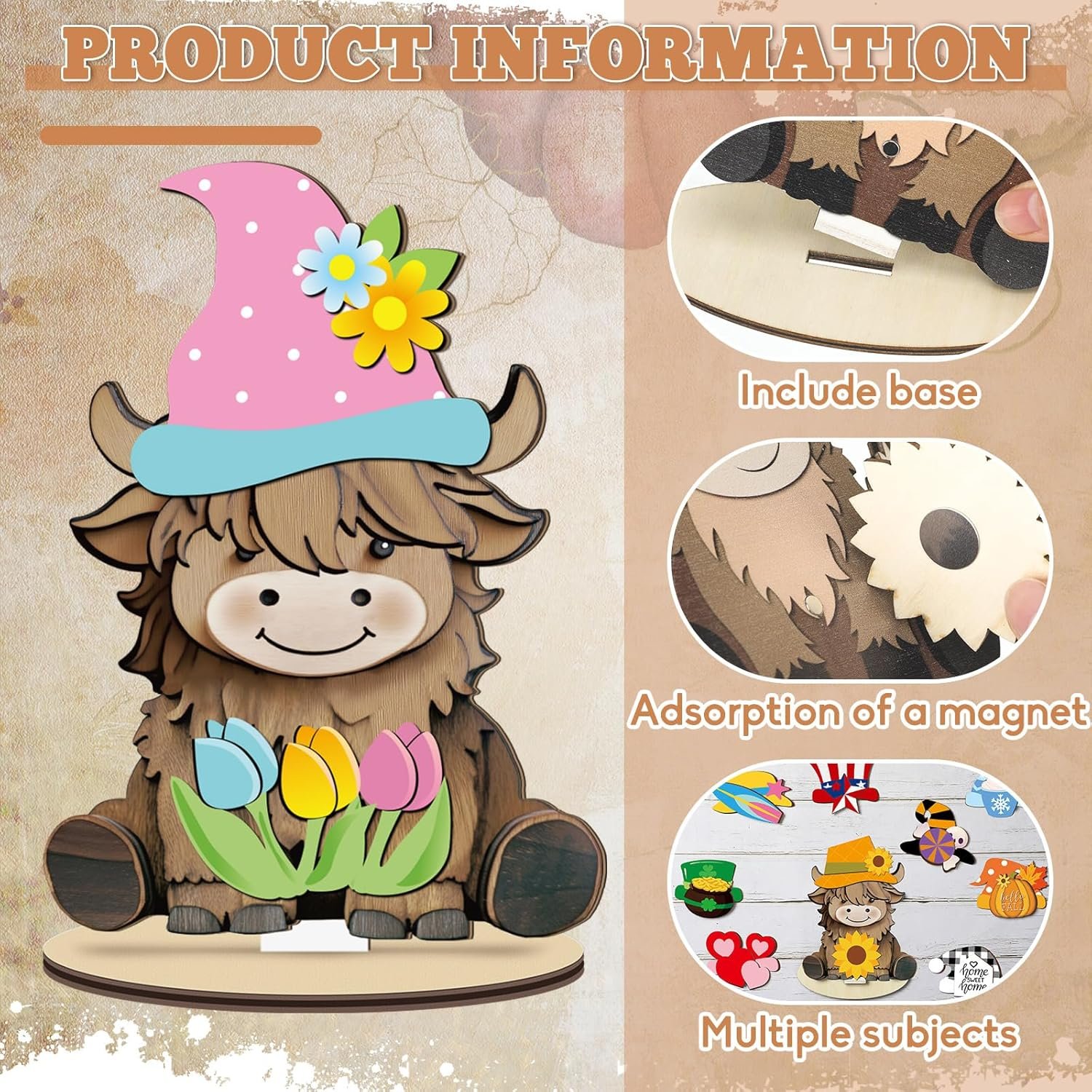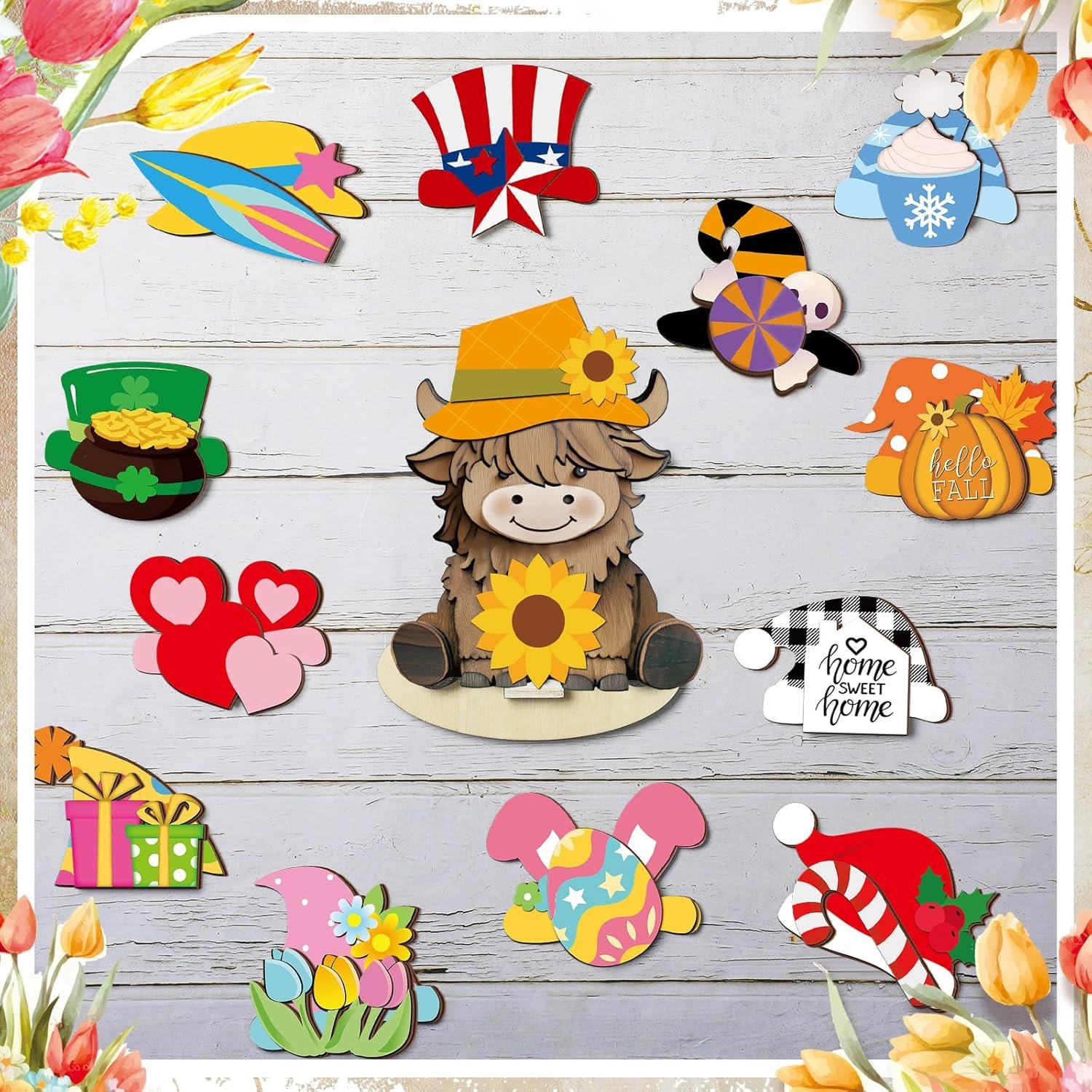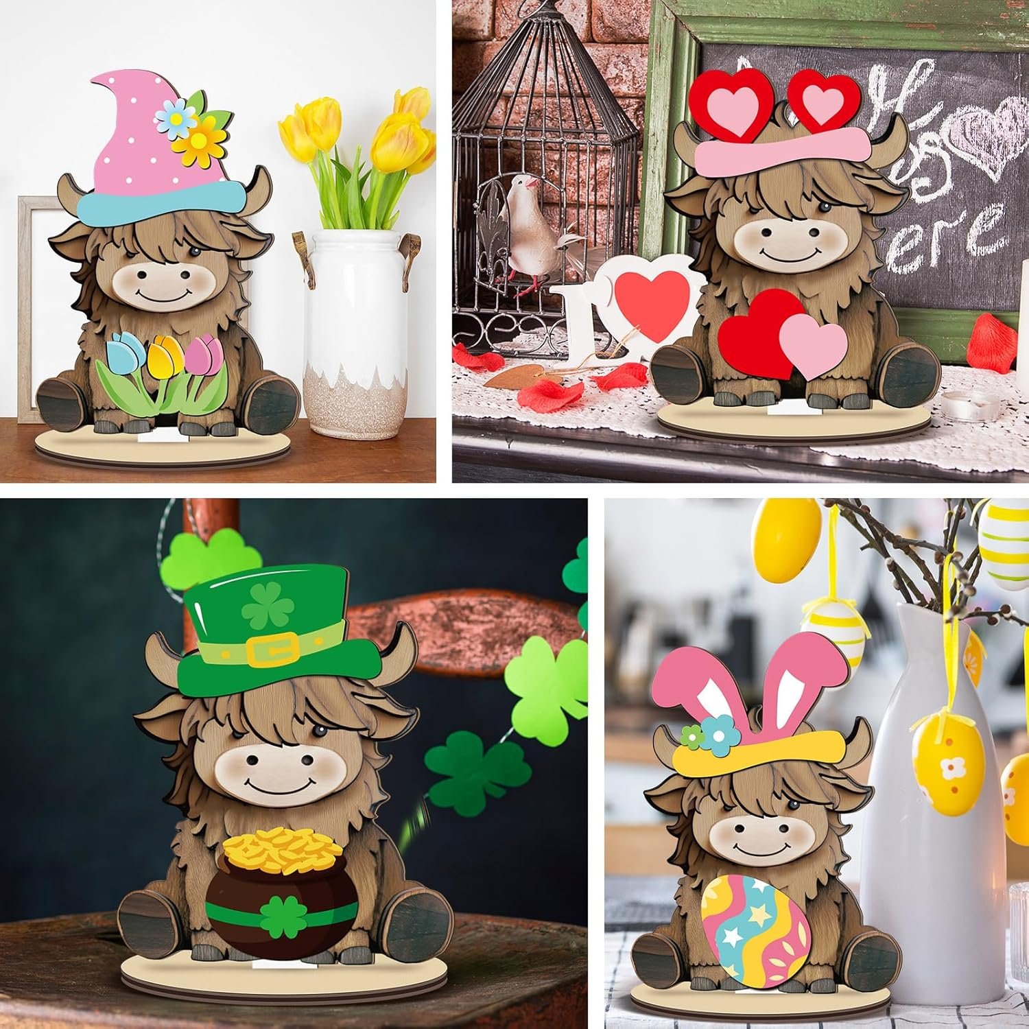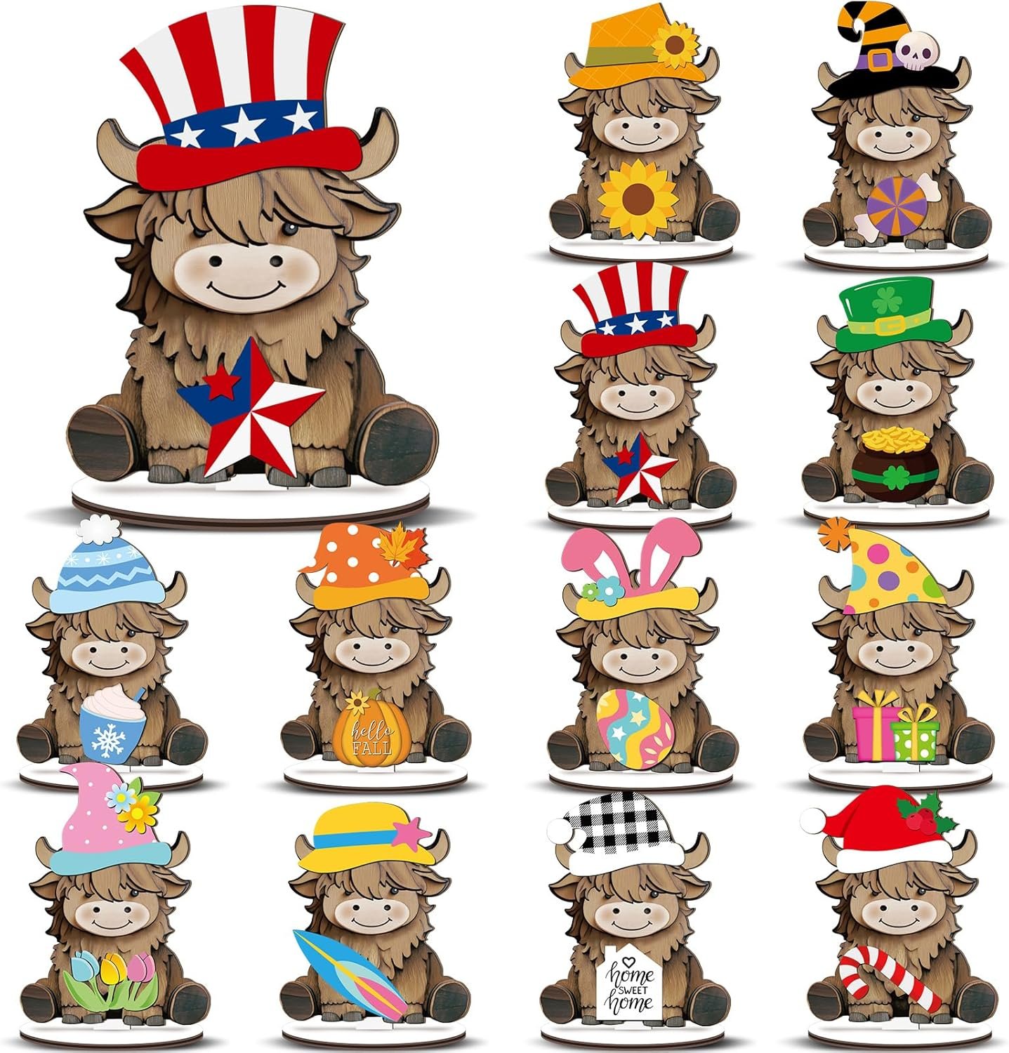 Interchangeable Highland Cow Decor Seasonal Signs Farmhouse Table Centerpiece with Holiday Icon Rustic Tiered Tray Decor Spring Easter for Home Desk Gift (Cute, 27 Pcs)