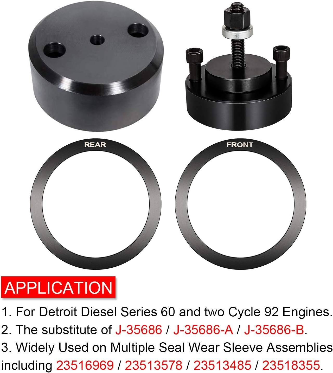 APPLICATION:Heavy duty J-35686-B Seal & Wear Sleeve Installer for Detroit, works on Detroit Diesel Series 60, two cycle 92 engines, widely used on multiple seal & wear sleeve assemblies including 23516969 / 23513578 / 23513485 / 23518355