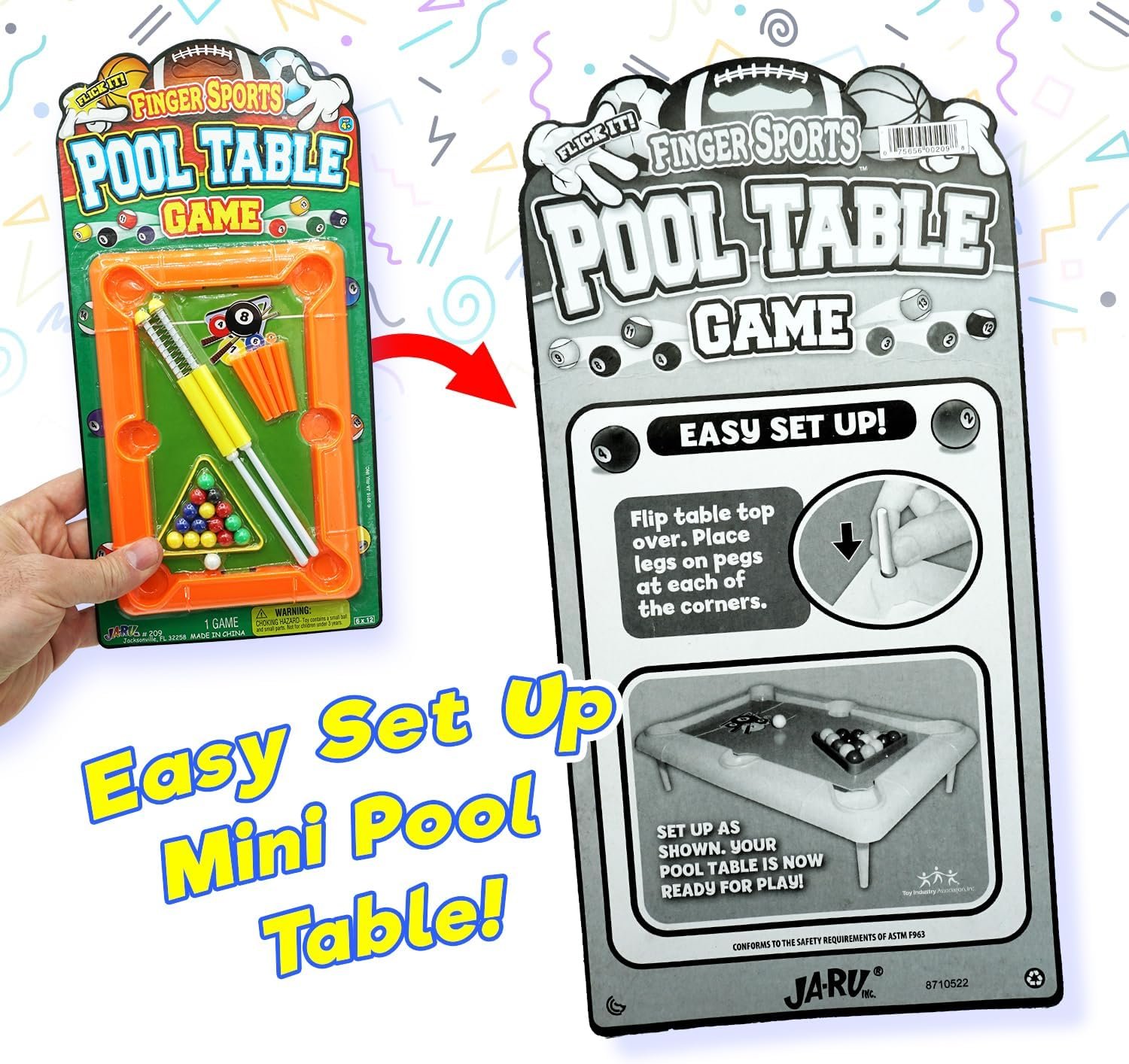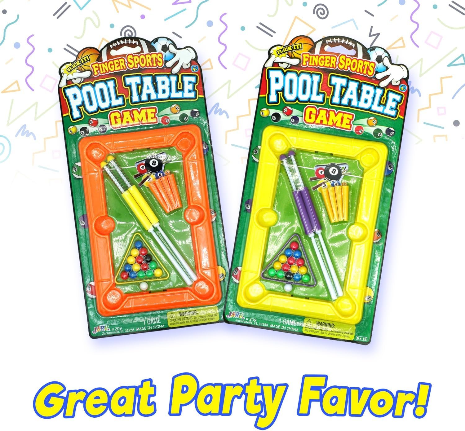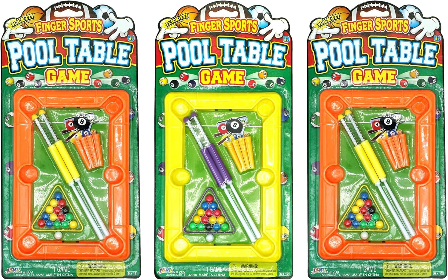 3 Pack of Finger Sports Pool Table Game (Assorted Colors) – Each set includes 1 mini pool table, 2 cue stick w/ 4 cue tips and 16 billiard balls. A complete game set for kids and adults . Plus 1 FunaTon Sticker.