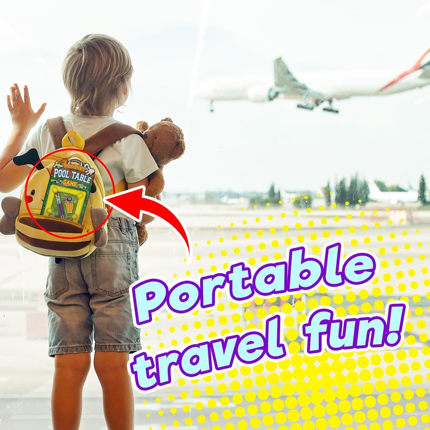 Portable Pool Table – This mini kids pool table is made from durable & non toxic plastic. The small size of these mini tabletop pool set makes it fit in your bag or pockets. 12 Inch travel size.
