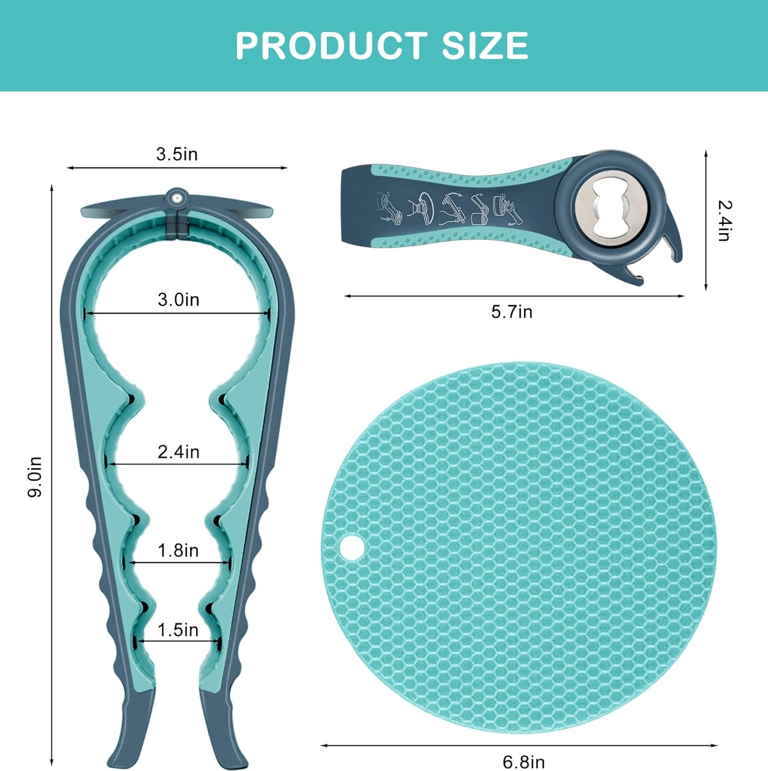 Ergonomic design – The long handles will provide the strength and leverage you need to open effortlessly, the nonslip handles will ensure safety even when wet, the jar grip will provide superior grip when opening stubborn jars and containers of all sizes.