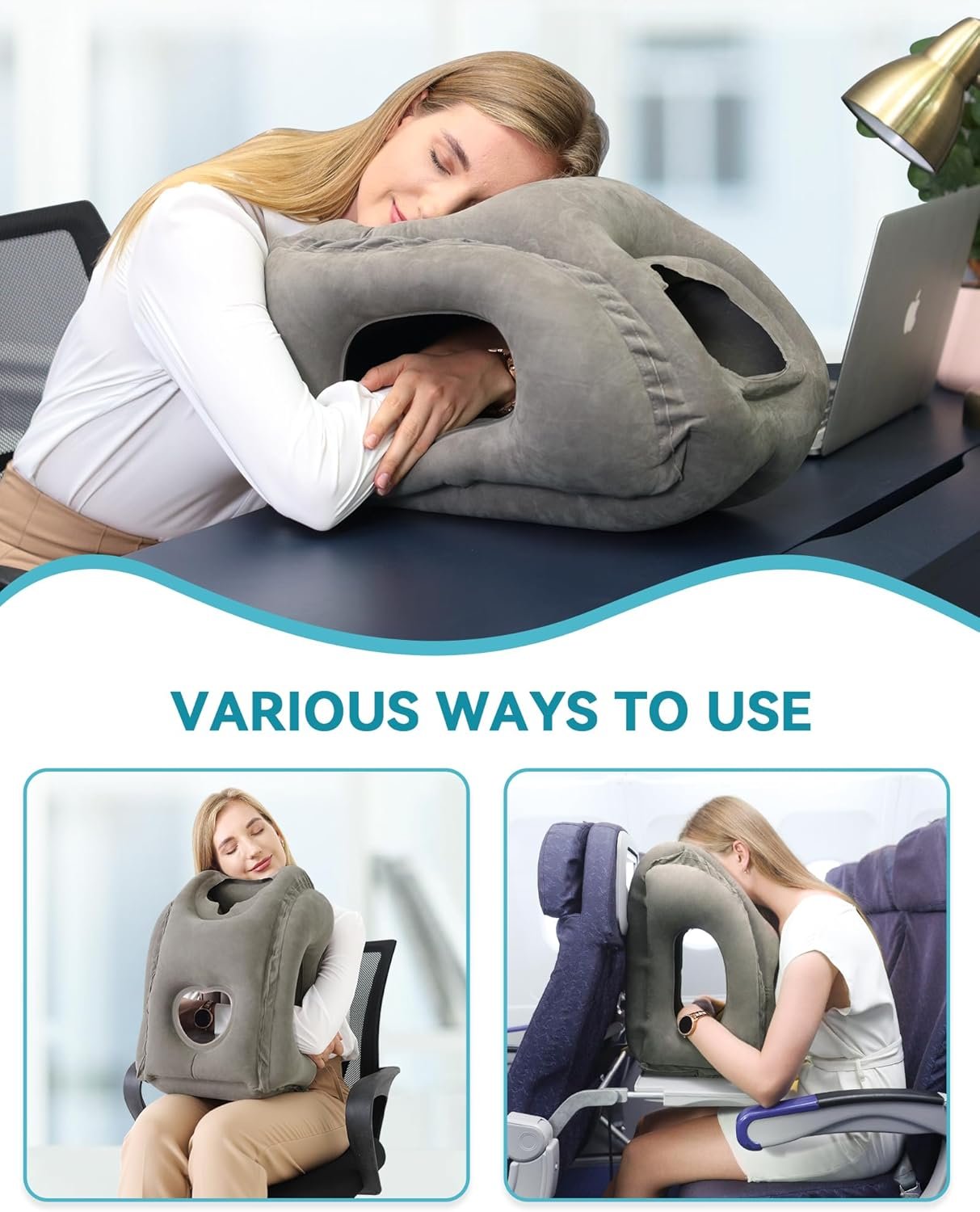 JefDiee Inflatable Travel Pillow, Airplane Neck Pillow Comfortably Supports Head and Chin for Airplanes, Trains, Cars Office Napping on The Tray Table (Grey)