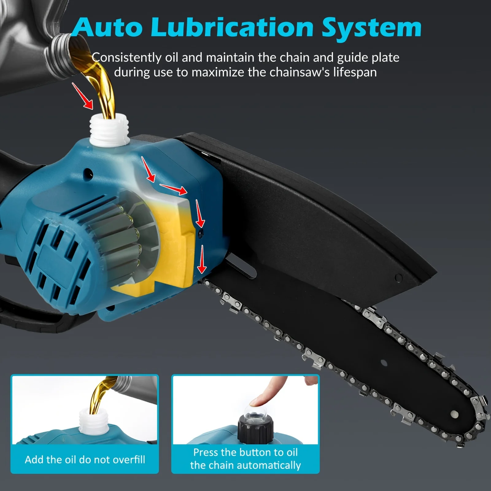 The saw has a reservoir for chain oil which is great. (Some Other Mini Chainsaws Do Not Have That!) “Automatic” oiling isn’t self oiling like a larger saw, but a bulb you push to feed oil to the bar and chain. All of these mini saw blades require lubrication to work at their best so you should press the lubrication button fairly often while cutting. (Universal Saw Chain Oil for Fast Efficient Cutting Is Recommended.)