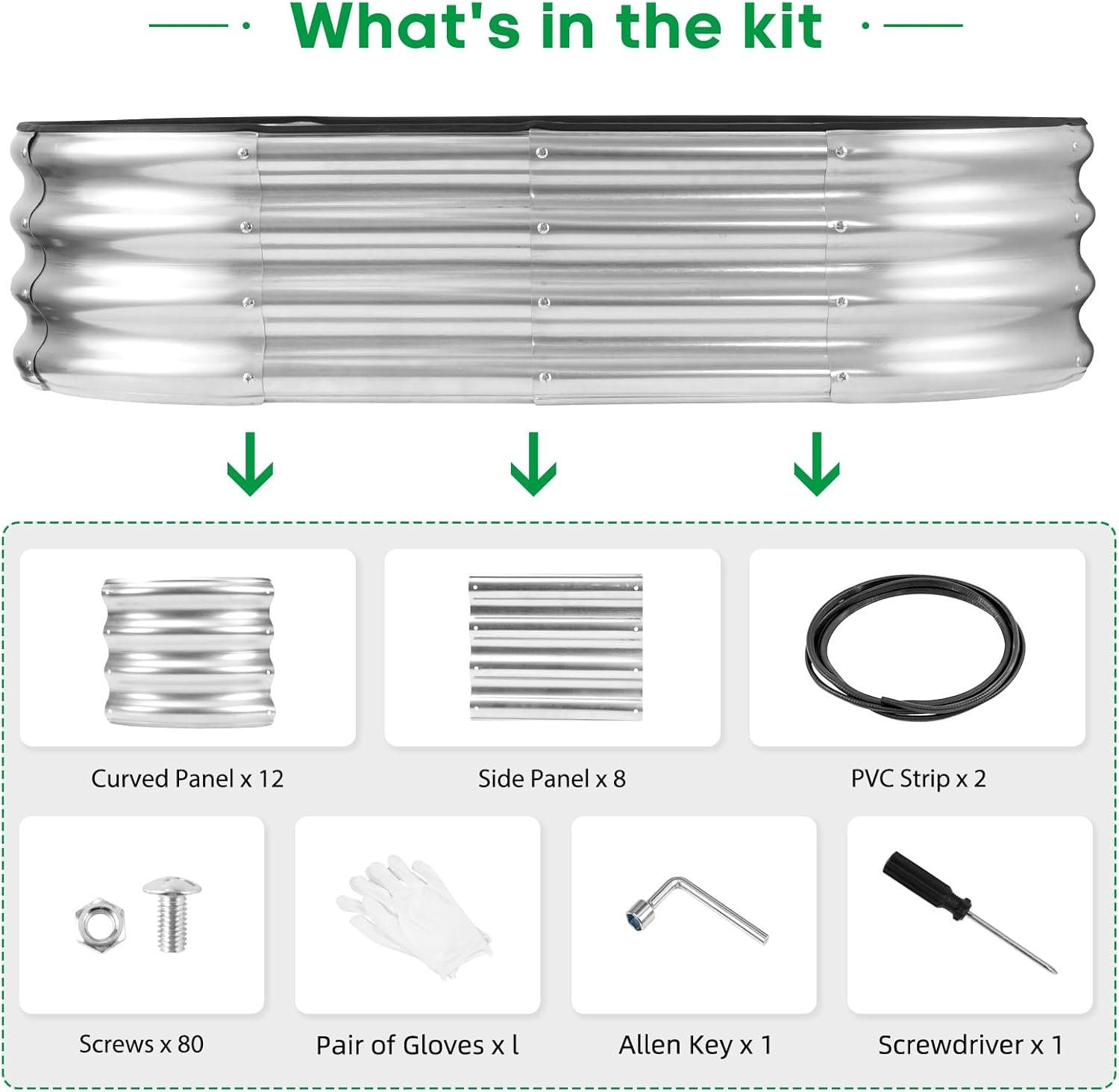 What You Get: we have included Galvanized raised garden bed kit with detailed assembly instructions, rubber edge strips, safety gloves , wrench tools and with galvanized nuts and bolts in the box .These essential tools elevate your overall planting and gardening adventure.