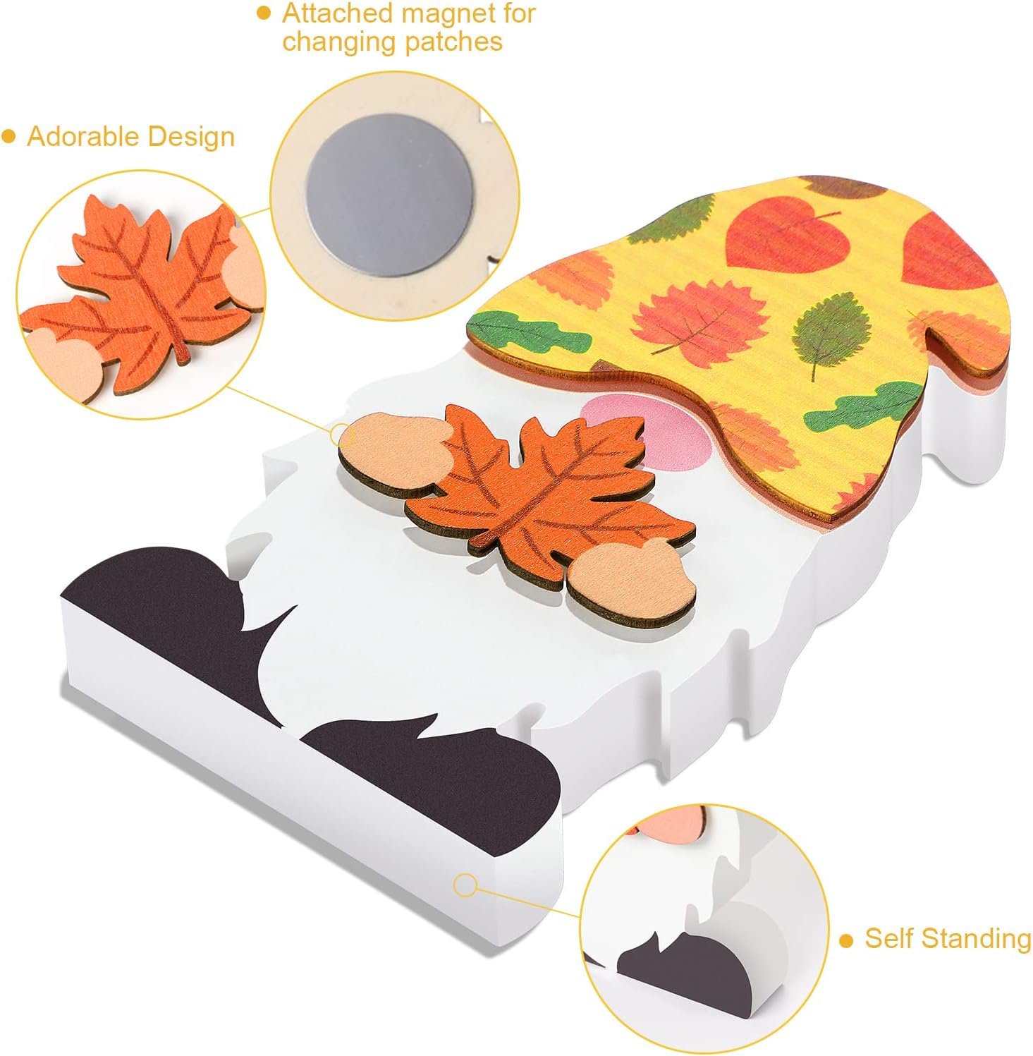Package includes: a self-standing wood gnome along with 24 pcs different interchangeable shapes including 12 pieces of hat and 12 pieces of things in its hand to change as you like, each piece has magnet and iron sheets attached to it to easily switch